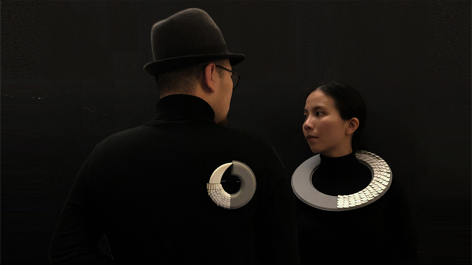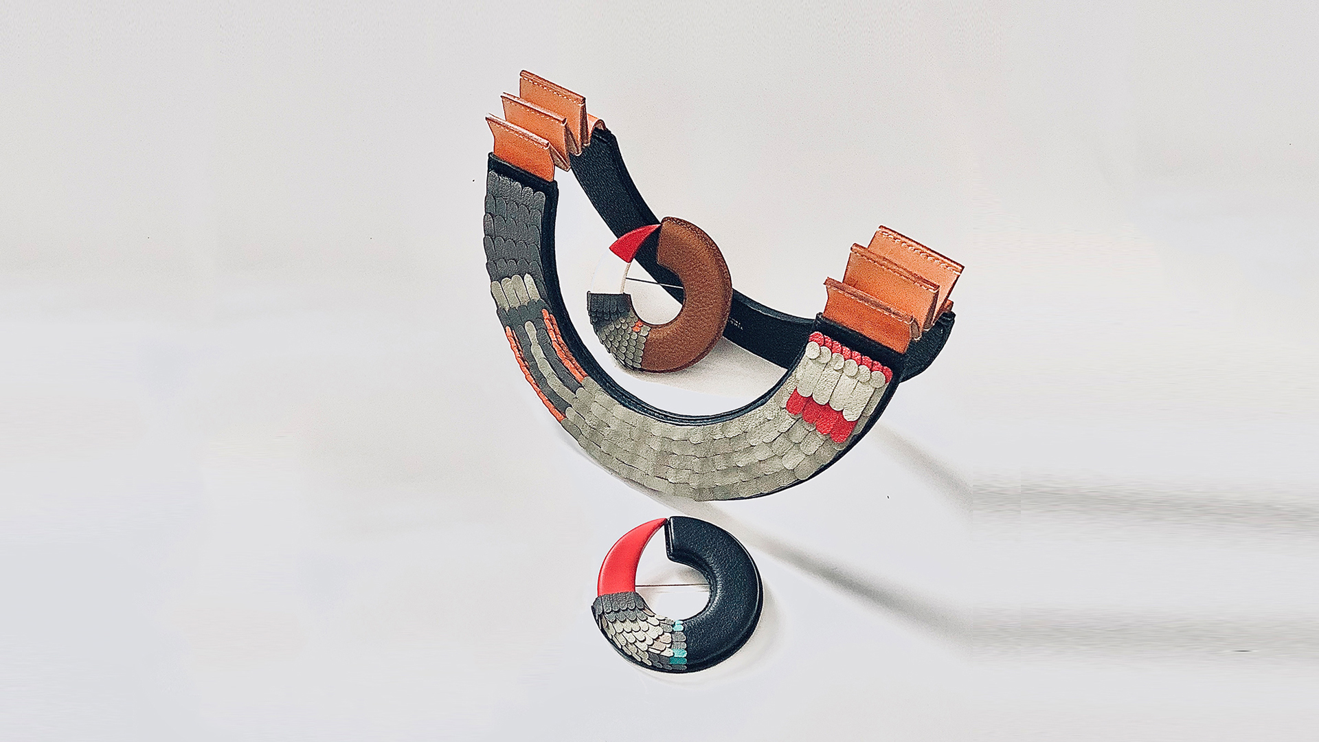 The materials used in Chen’s work, such as silver, leather, wood, express her reflections on family and marital relationships and the relationship between the individual and the group and the objects themselves are a mechanism to draw us emotionally together, telling stories and connecting the wearer to others.