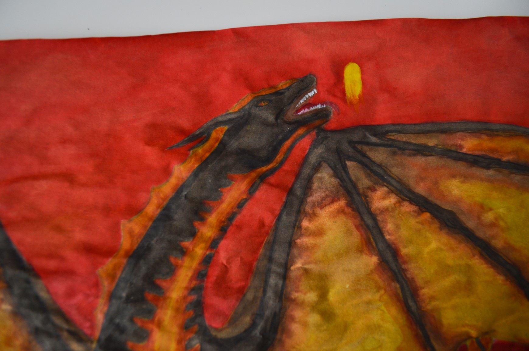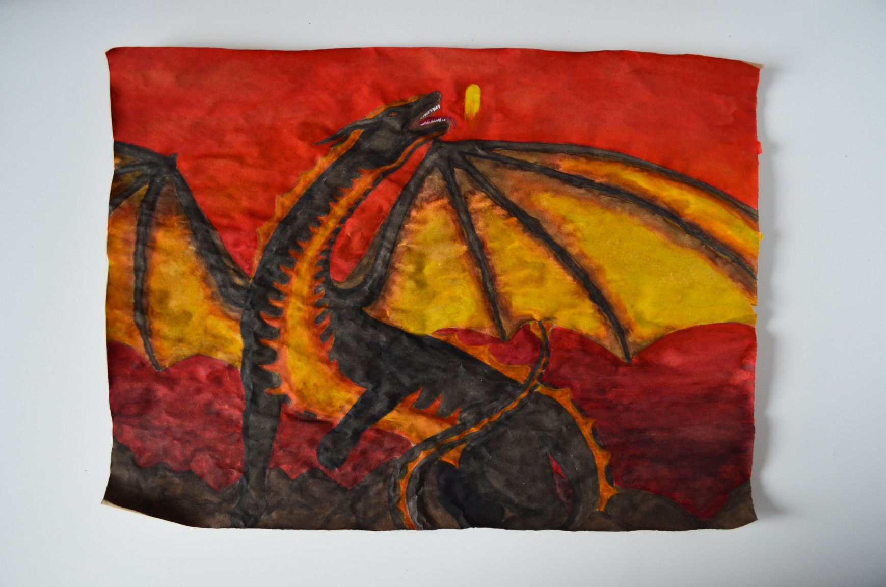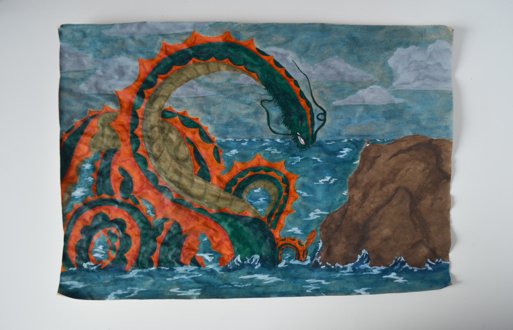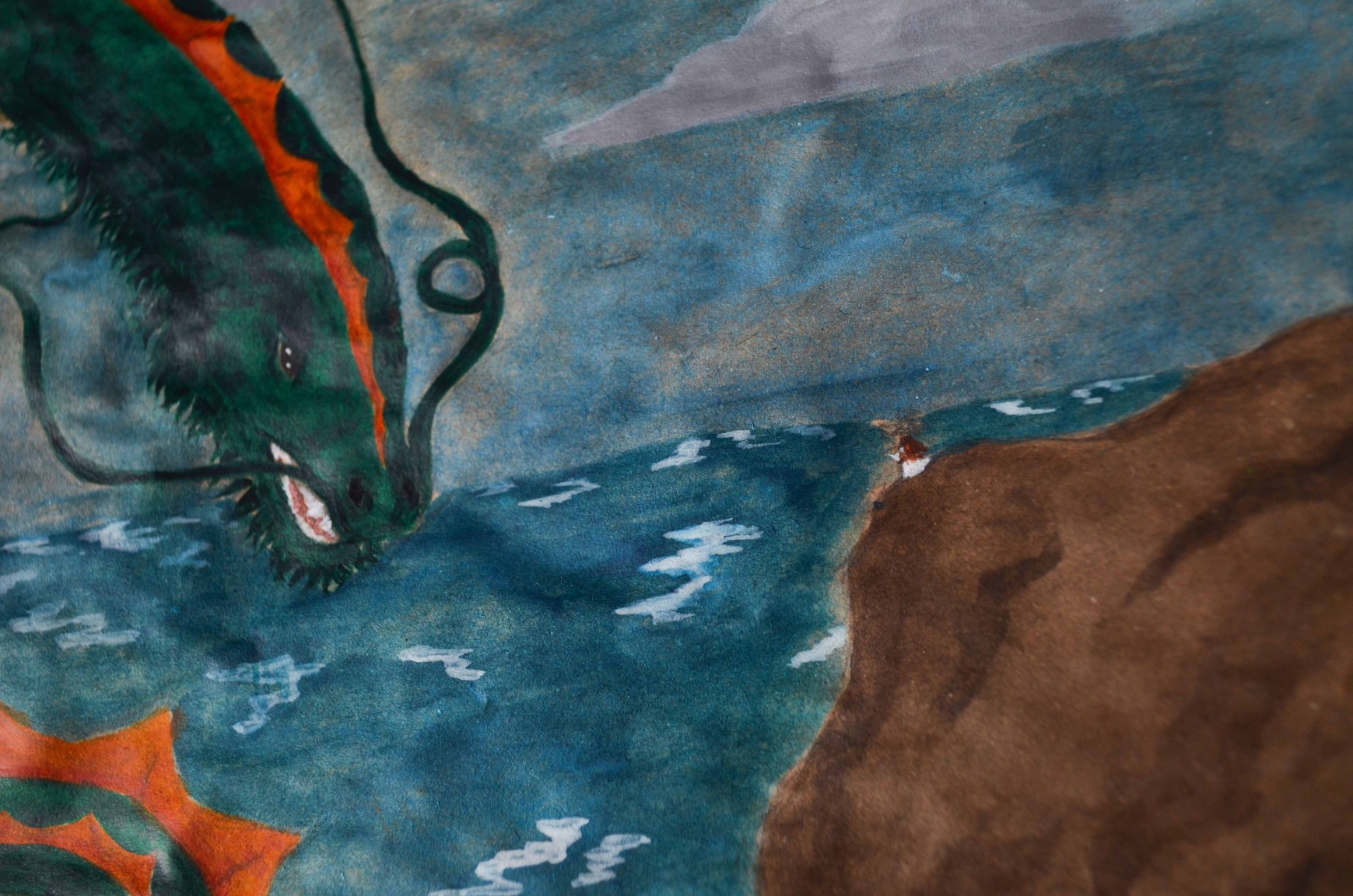 Using the fantasy alphabet, ink, and calligraphy paper Lampe has written a prophecy the protagonists will come across in the story. Elsewhere illustrations depict Schattenklage myths including a watercolor painting of a sea serpent who comes across a young woman on a rock in the ocean and a dragon who is about to eat a star or to be more specific the sun.