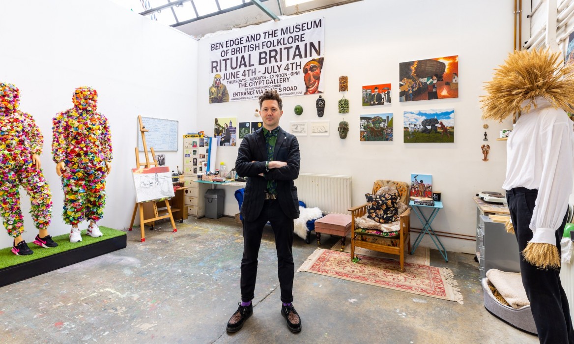 Since then, inspired by a serendipitous experience in which Ben stumbled across a Druid ceremony taking place on Tower Hill in central London, he has been researching the folklore and seasonal customs of the British Isles and was amazed to discover that there were such events taking place all over the Uk. Although he was not entirely conscience of it at the time, a new obsession had been born and he began travelling up and down the British Isles, extensively gathering source material and responding to his research through a new series of twenty paintings and a full length documentary film. This body of work titled ‘Frontline Folklore’ was exhibited alongside a carefully curated selection of objects from the influential set designer, Simon Costin’s remarkable ‘Museum of British Folklore’ collection at the Crypt gallery of the St Pancras new church throughout June 2021, in an exhibition titled ‘Ritual Britain’ that attracted over 10,000 visitors with extensive media coverage and viral exposure across social media.