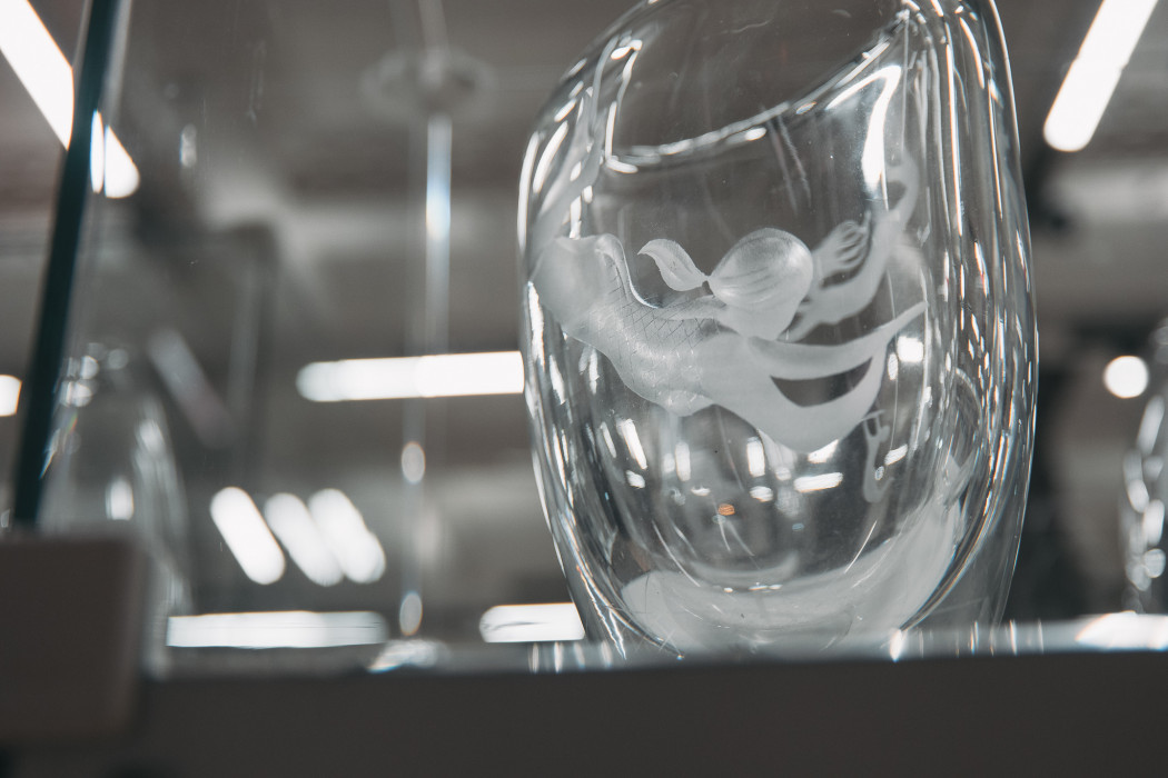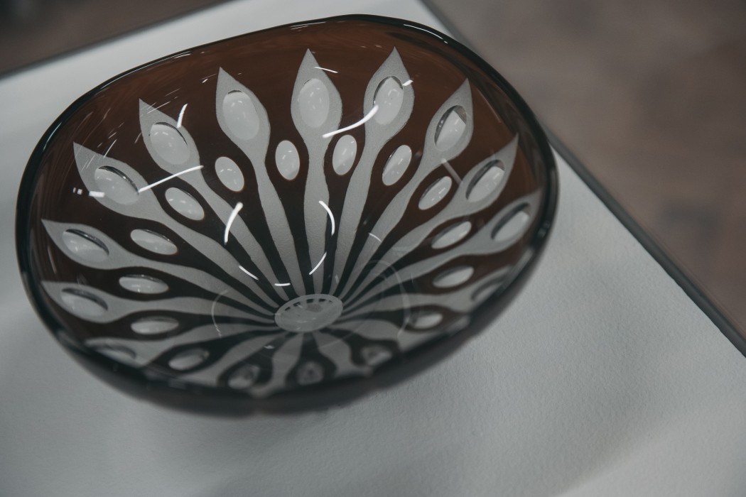 At Åfors, Ernest Gordon Adsetts was given some considerable freedom to experiment “I didn’t design a single piece for six months, just spent my time drawing, modelling, wandering into the factory and picking up some of the elements of glass technology”. This freedom is very visible in the work – whether the whimsical storytelling of his etched pieces, or the playful variations on the effects of a particular technical process – for example trapping a bubble inside glass.