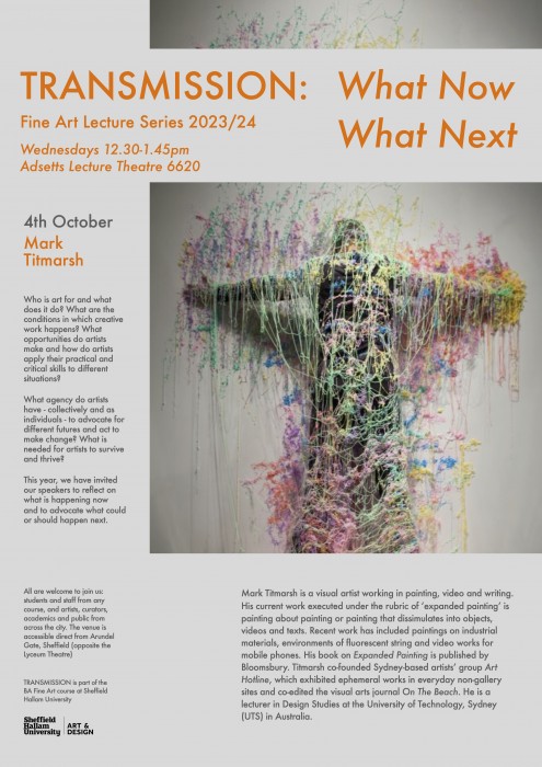 Mark Titmarsh is a visual artist working in painting, video and writing. His current work executed under the rubric of expanded painting about painting or painting that dissimulates into objects, videos and texts. recent work has included paintings on industrial materials, environments of fluorescent string and video works for mobile phones. His book on Expanded Painting is published by Bloomsbury. Titmarsh co-founded Sydney-based artists’ group Art Hotline, which exhibited ephemeral works in everyday non-gallery sites and co-edited the visual arts journal On the Beach. He is a lecturer in Design Studies at the University of Technology, Sydney, Australia.