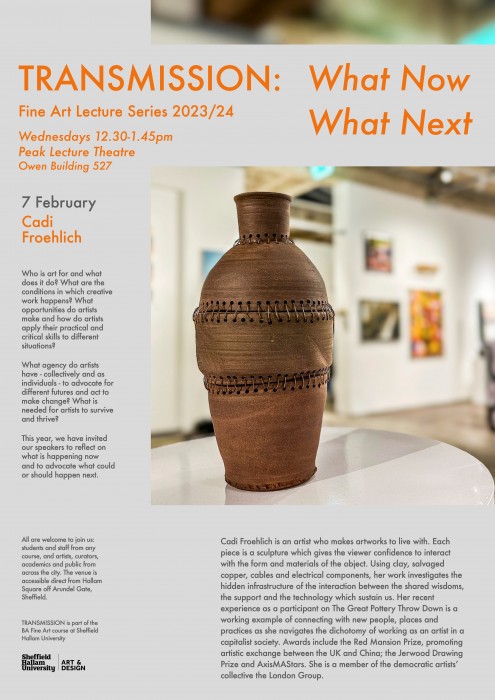 Cadi Froehlich is an artist who makes artworks to live with. Each piece is a sculpture which gives the viewer confidence to interact with the form and materials of the object. Using clay, salvaged copper, cables and electrical components, her work investigates the hidden infrastructure of the interaction between the shared wisdoms, the support and the technology which sustain us. Her recent experience as a participant on The Great Pottery Throw Down is a working example of connecting with new people, places and practices as she navigates the dichotomy of working as an artist in a capitalist society. Awards include the Red Mansion Prize, promoting artistic exchange between the UK and China; the Jerwood Drawing Prize and AxisMAStars. She is a member of the democratic artists’ collective The London Group.