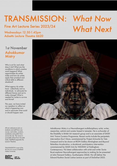 Ashokkumar D Mistry is a Neurodivergent multidisciplinary artist, writer, researcher, activist and curator based in Leicester. He is co-founder of the Disability in British Art research group and is an associate of DASH Arts’ Future Curators Programme. Recent works include the peripatetic intervention Don’t Stare, commissioned by Project Artworks for Tate Liverpool and to be shown at IKON Gallery Birmingham and Beyond Relentless Acceleration, a durational, participatory intervention commissioned by DASH Arts for We Are Invisible We Are Visible at Nottingham Contemporary. His latest collaboration with artist and writer Sonia Boué explores Neurodivergent approaches to making (to be presented at John Hansard Gallery, Southampton 2024). He will deliver the Edward Rushton Social Justice Lecture as part of DaDaFest 2023.
