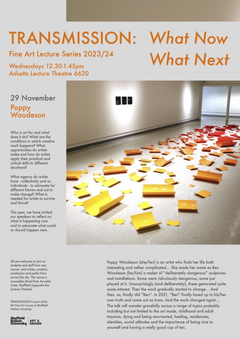 Poppy Woodeson (she/her) is an artist who finds her life both interesting and rather complicated… She made her name as Ben Woodeson (he/him) a maker of “deliberately dangerous” sculptures and installations. Some were ridiculously dangerous, some just played at it. Unsurprisingly (and deliberately), these generated quite some interest. Then the work gradually started to change… And then, so, finally did “Ben”. In 2021, “Ben” finally faced up to his/her own truth and came out as trans. And the work changed again…