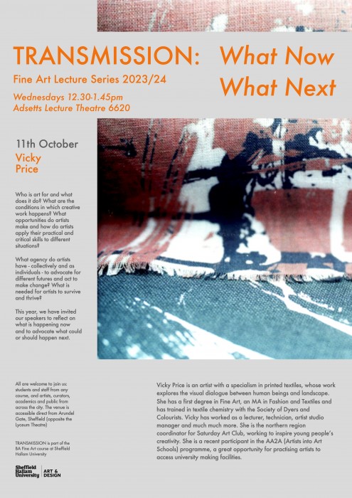 Vicky Price will present the next in our Transmission series. Vicky is an artist with a specialism in printed textiles, whose work explores the visual dialogue between human beings and landscape. She has a first degree in Fine Art, an MA in Fashion and Textiles and has trained in textile chemistry with the Society of Dyers and Colourists. Vicky has worked as a lecturer, technician, artist studio manager and much much more. She is the northern region coordinator for Saturday Art Club, working to inspire young people’s creativity. She is a recent participant in the AA2A (Artists into Art Schools) programme, a great opportunity for practising artists to access university making facilities.