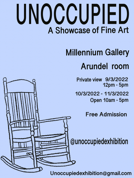 Unoccupied is a student-initiated exhibition which brings together 36 BA and MFA Fine Art Students, exhibiting together in Sheffield’s Millennium Gallery.