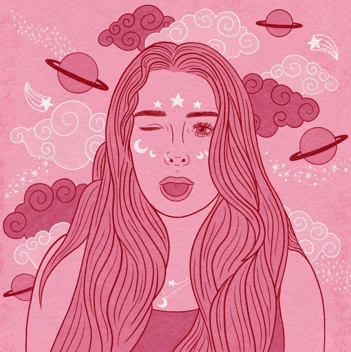 Bryony Sharn is an illustrator who enjoys pulling elements of the 1960s and 1970s into her work, such as illustration, fashion and music. She uses warm tones, limited colour palettes, and unique textures for a vintage look. Sharn describes her work as ‘whimsical and fantastical’, with a prominence on the female form. Her work focuses on creating unique characters, often influenced by special effects makeup, mythological goddesses, star signs and Tarot cards.