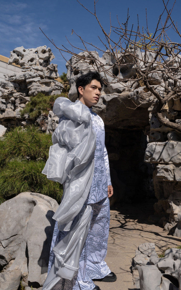 Chi You draws inspiration from observing life and his hometown’s rich culture. His aim is to connect the past with the present through exploration of tradition and his inner world. Reflecting on the emotional values of today’s youth, You’s Neo-Chinese collection blends traditional cultural elements with modern fashion. His designs are inspired by oceanic and island motifs, with a particular focus on the Sea Goddess Mazu, a symbol of freedom. Referencing traditional art, he utilizes Chinese indigo dyeing for sustainability. His work merges cultural heritage with contemporary design, expressing both personal identity and modern relevance.