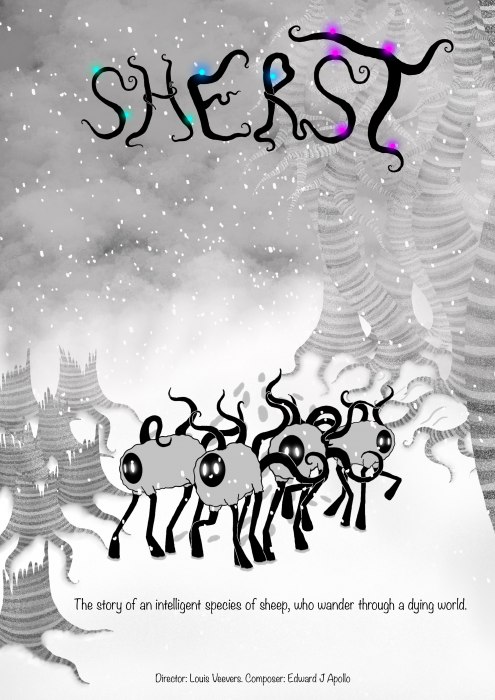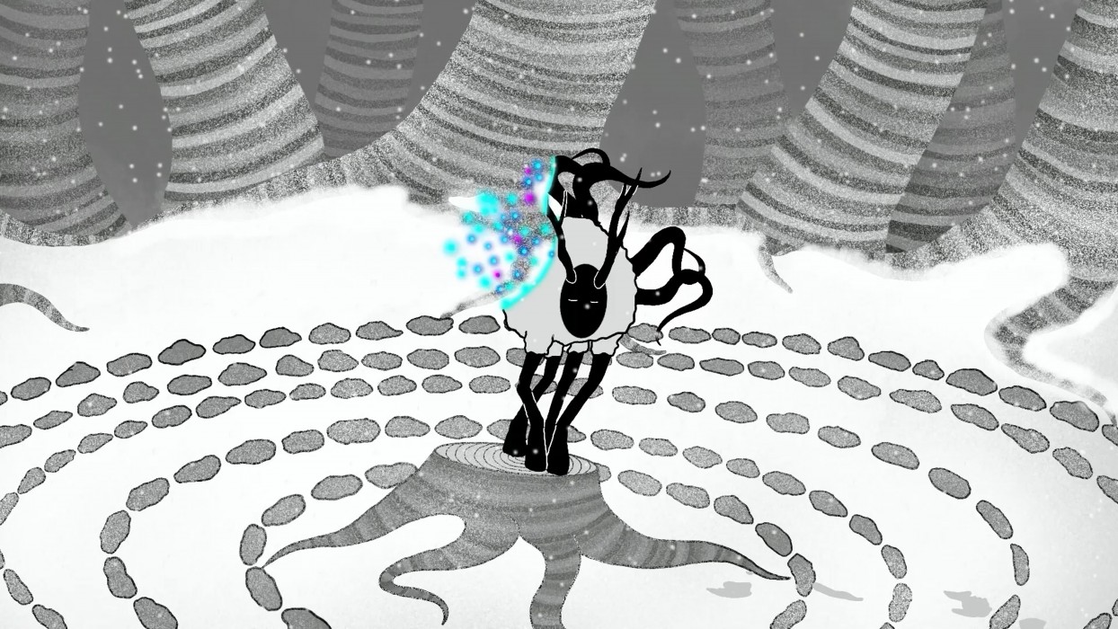 Louis Veevers animation шерсть (Sherst) takes its title from the Russian word for wool. The story is about a very unusual and intelligent species of sheep known as Moos wandering across the wilderness of Siberia. The film opens with establishing shots of the Siberian forests and continues with the herd of sheep roaming across the snowy landscape. The herd enters a clearing where there is a tree stump surrounded by stones. They gather in the clearing until one of the Moos sprouts antlers, climbs onto the tree stump and then starts to dissolve into colourful pollen particles which float in the air until they settle on the assembled group of Moos who then give birth to Moollings. This is intended as a sign of hope for the possible survival of the species.