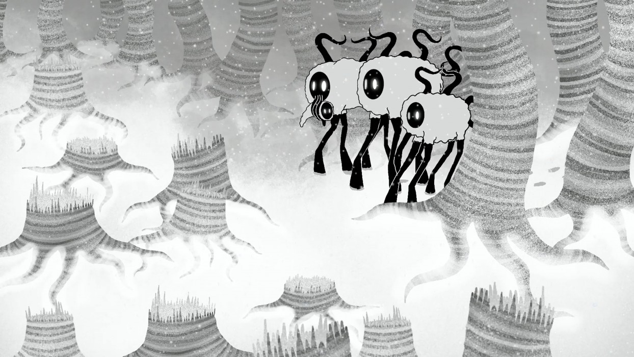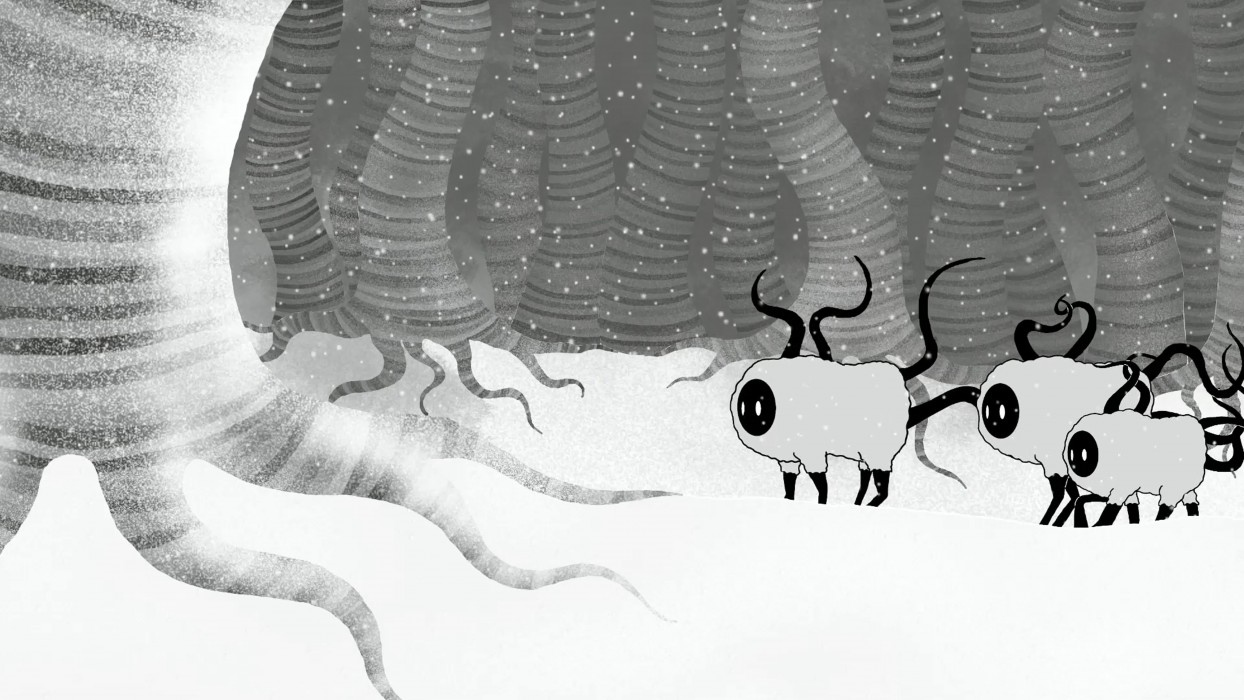 The monochrome animation conveys the cold bleak snowy environment as well as a gentle tranquillity. The soundtrack and foley sound effects add to a developing feeling of melancholy. Veevers is concerned by climate change and the gradual extinction of animal species, and the film’s elements of hope become progressively more and more desolate as the Moos encounter forest destruction and a lack of food.
