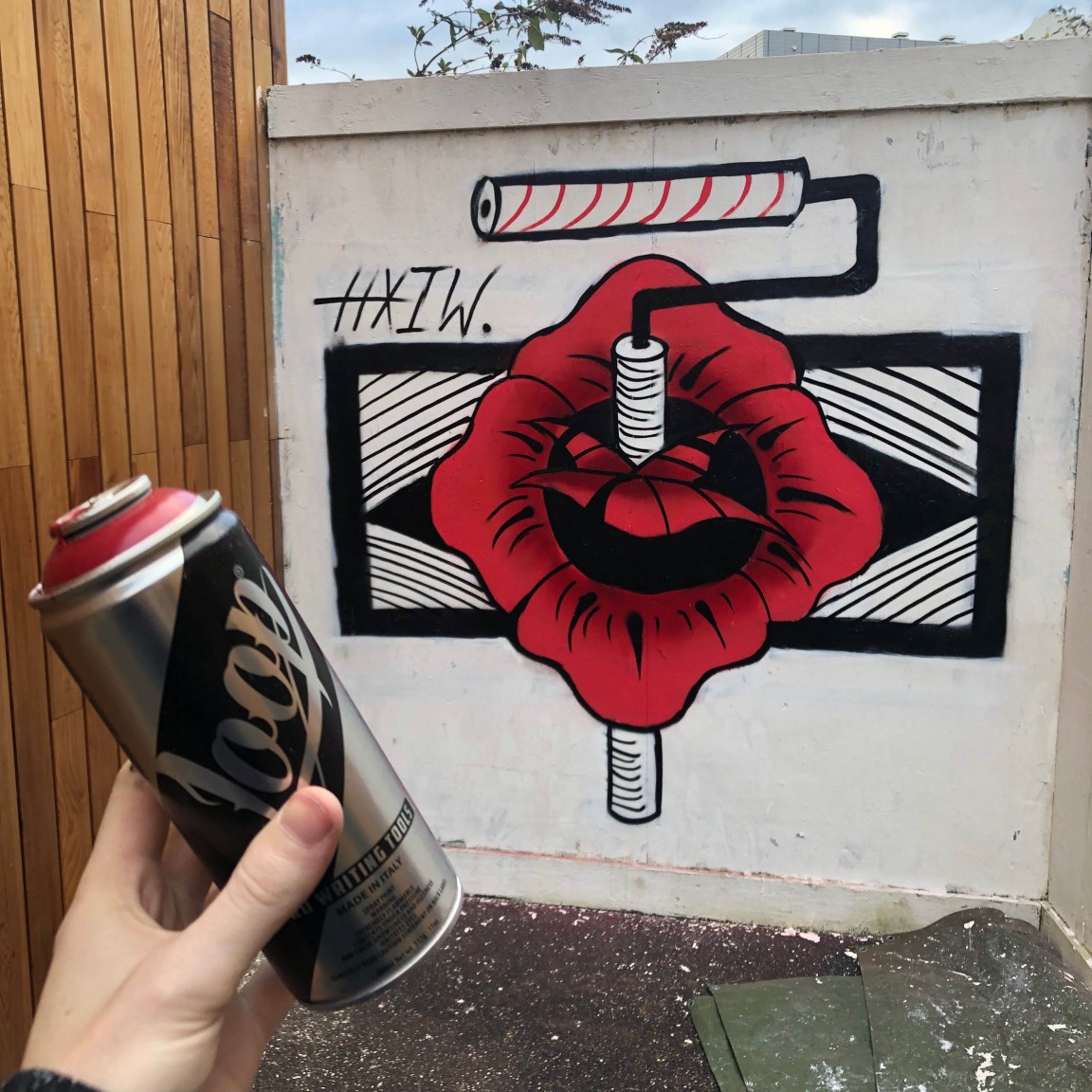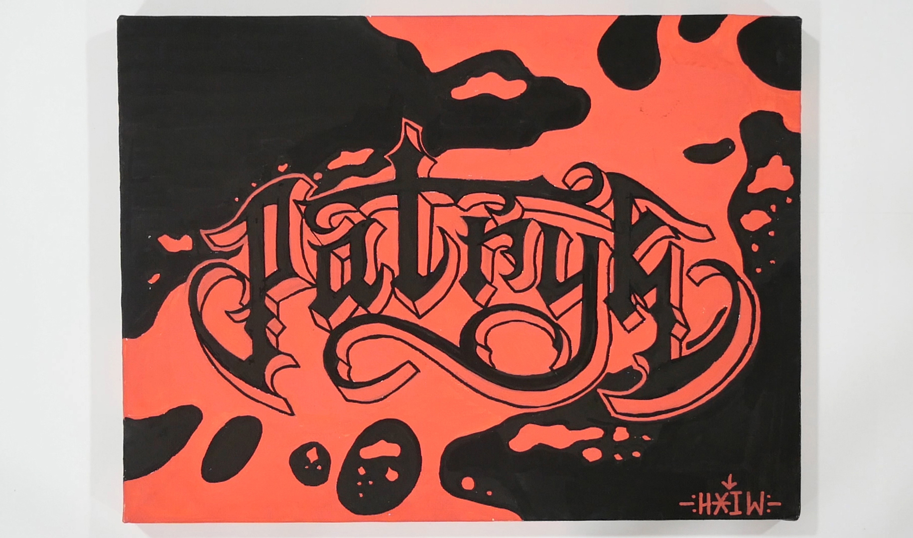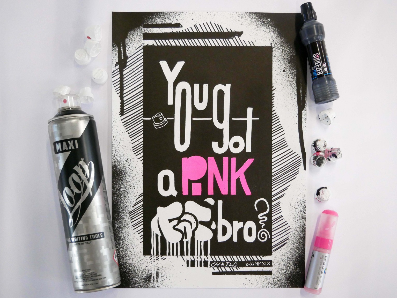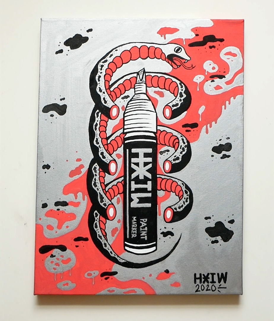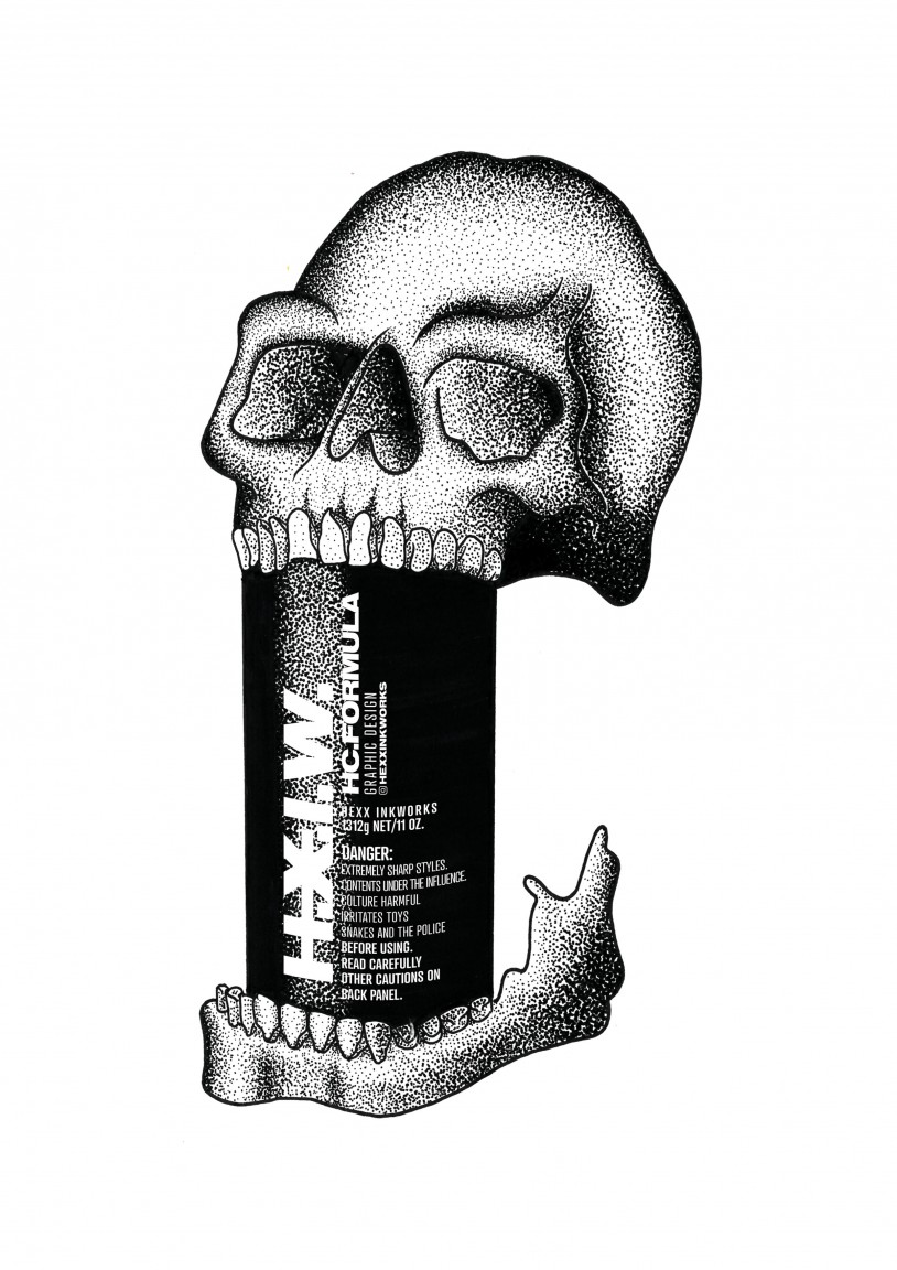 Hexx Inkworks’ visuals are immersed in punk and skate culture delighting in the expressionist movement of mosh pits and graffiti. It is not uncommon to see markers used in his work, from black fine liner to a wide tipped paint marker alongside aerosol paints.