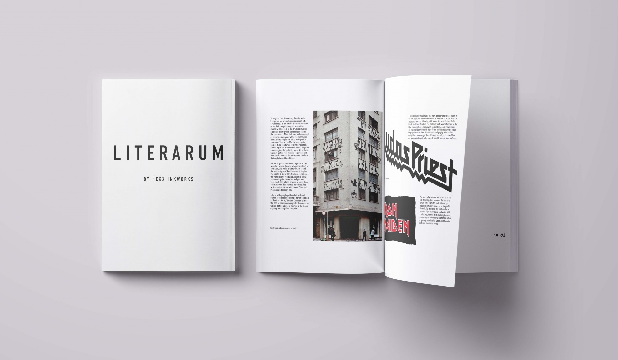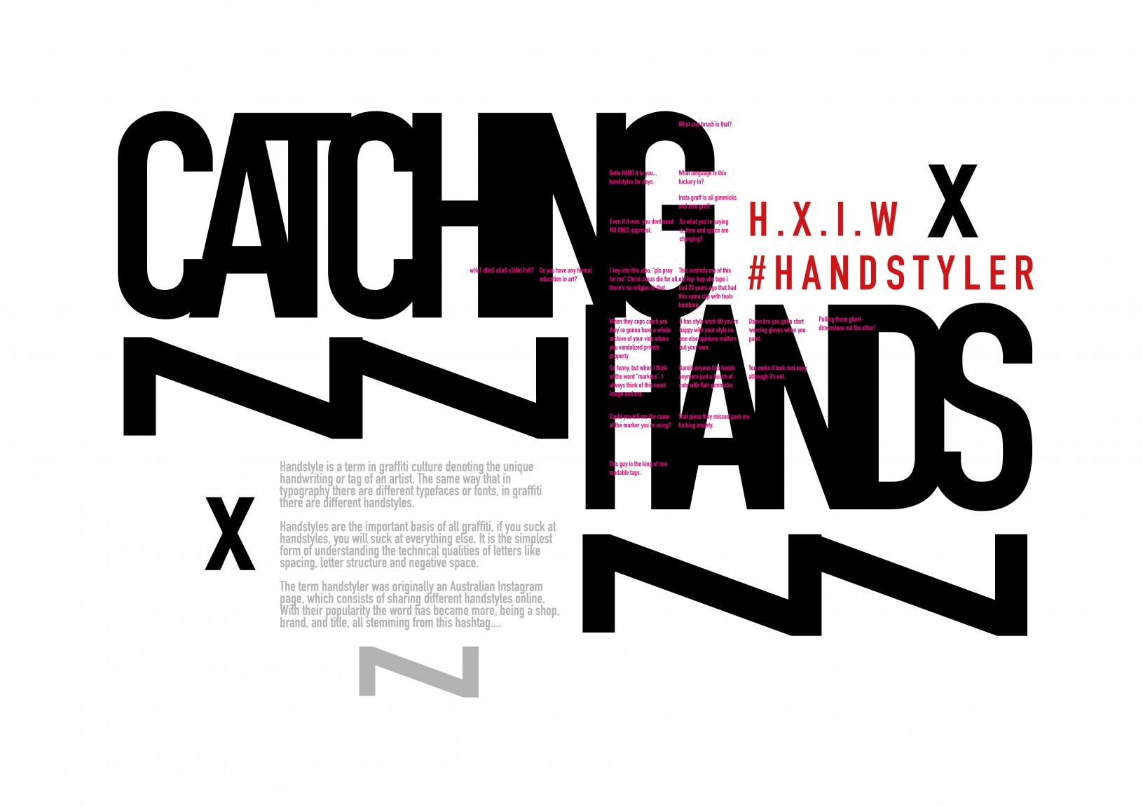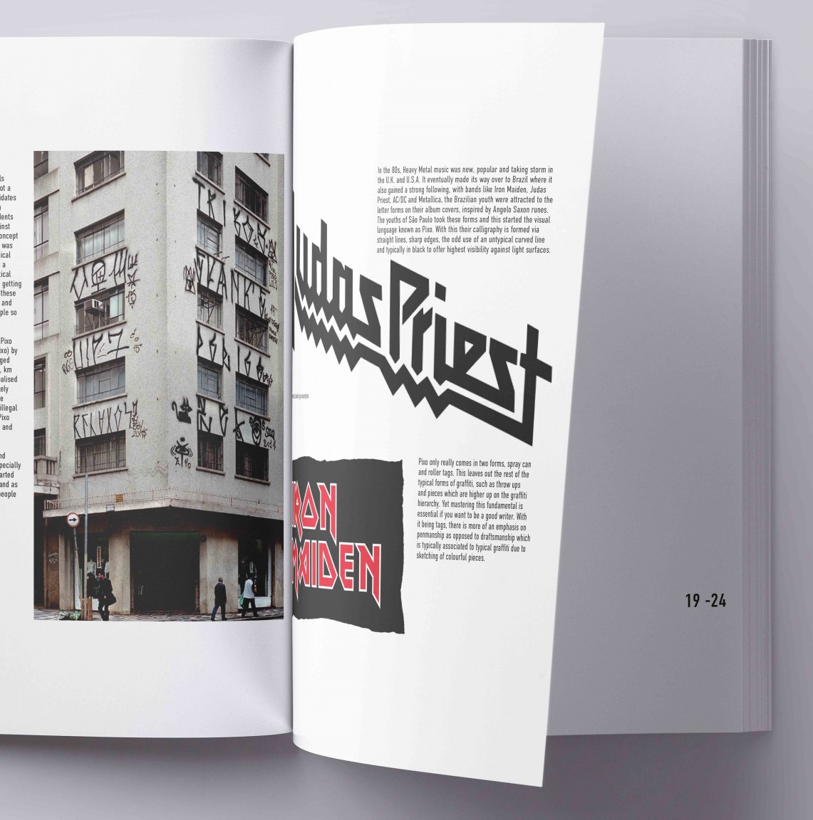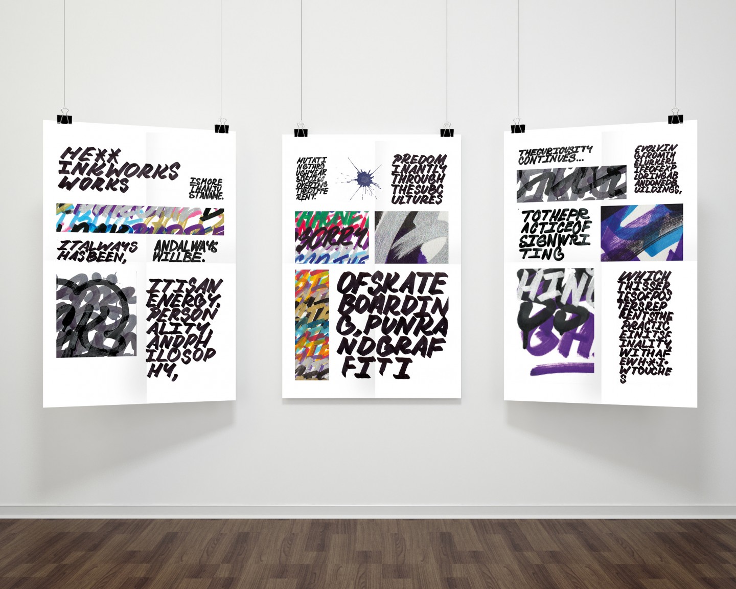 Hexx Inkworks’ hs used a combination of a Sharpie for the chisel tip, and graffiti mop marker for the rounded tip to create athe signwritten copy, whilst the the textures of the previous experiments were re-used as images. All is then scanned and brought together in InDesign.