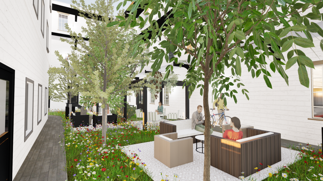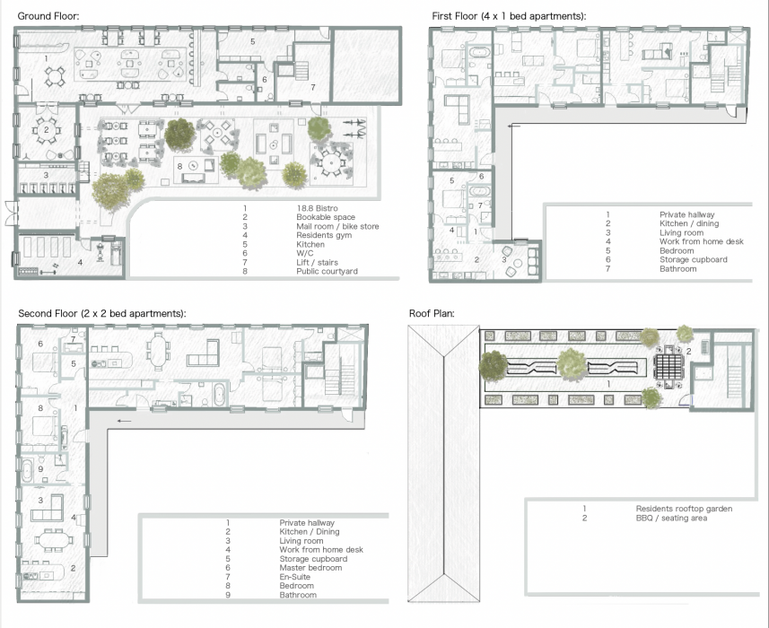 On the ground floor Lydia has created a bistro that will be open to the public throughout the day and into the night, it includes a bookable private dining space and outdoor seating. There is also a ‘parcel room’ where the residents can collect their post or store bikes, along with a resident only gym. On the roof, she has developed a garden with a BBQ and seating area for the residents to use as their own private outdoor space, it also includes 12 planters meaning each apartment gets two plant boxes to grow their own greenery. Additionally, she has designed 6 individual apartments; on the first floor there are 4 x 1-bedroom apartments and on the second floor there are 2 x 2-bedroom apartments. These all include important amenities such as storage rooms, work from home stations, private entrances and large open plan living spaces.