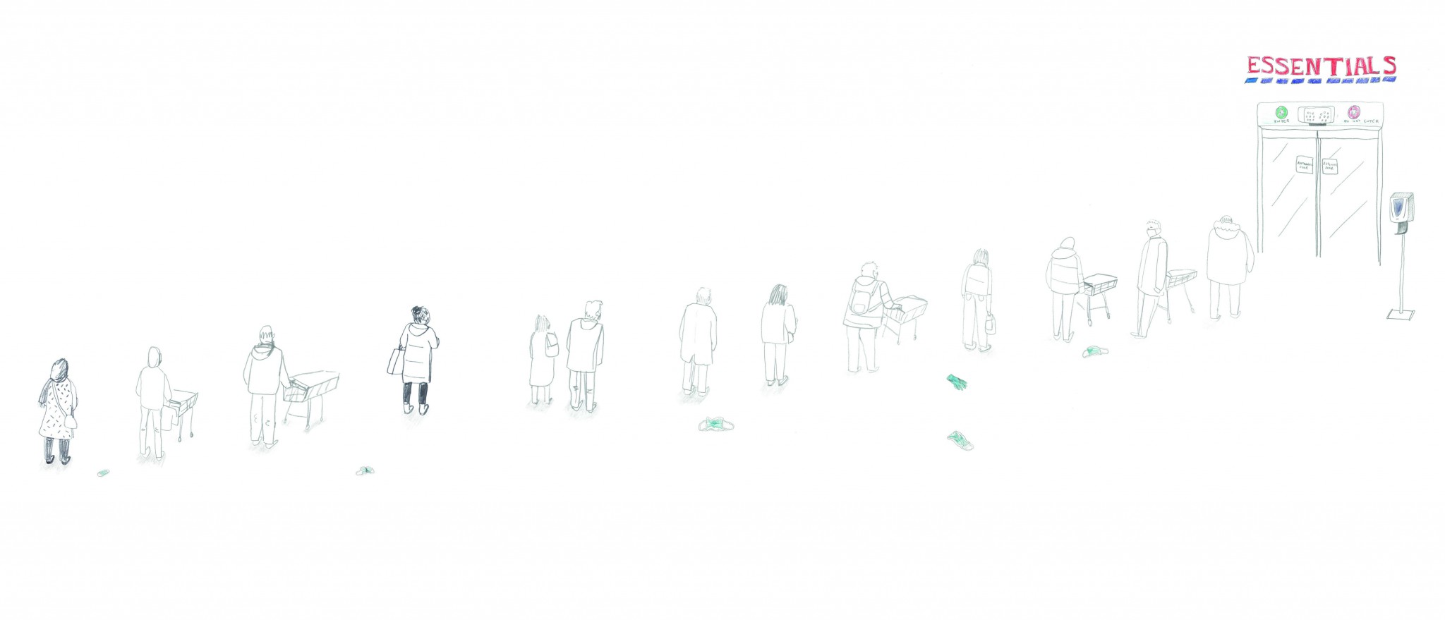 Storm Meakin has created illustrations examining human behaviour throughout the UK lockdown of November 2020. Intense queuing has become a very normal aspect of life, due to the social distancing measures in shops, as the public are required to stand two metres apart and wear masks.
