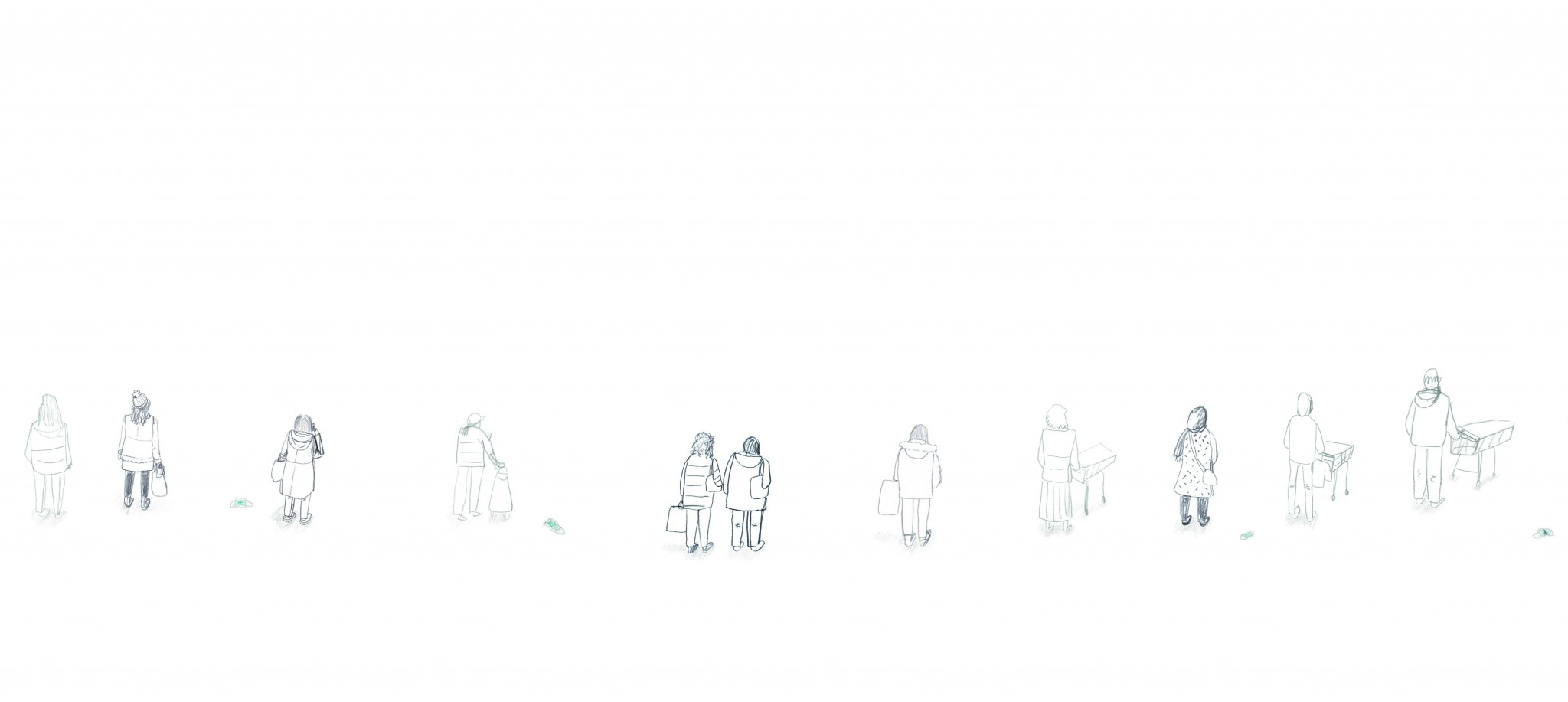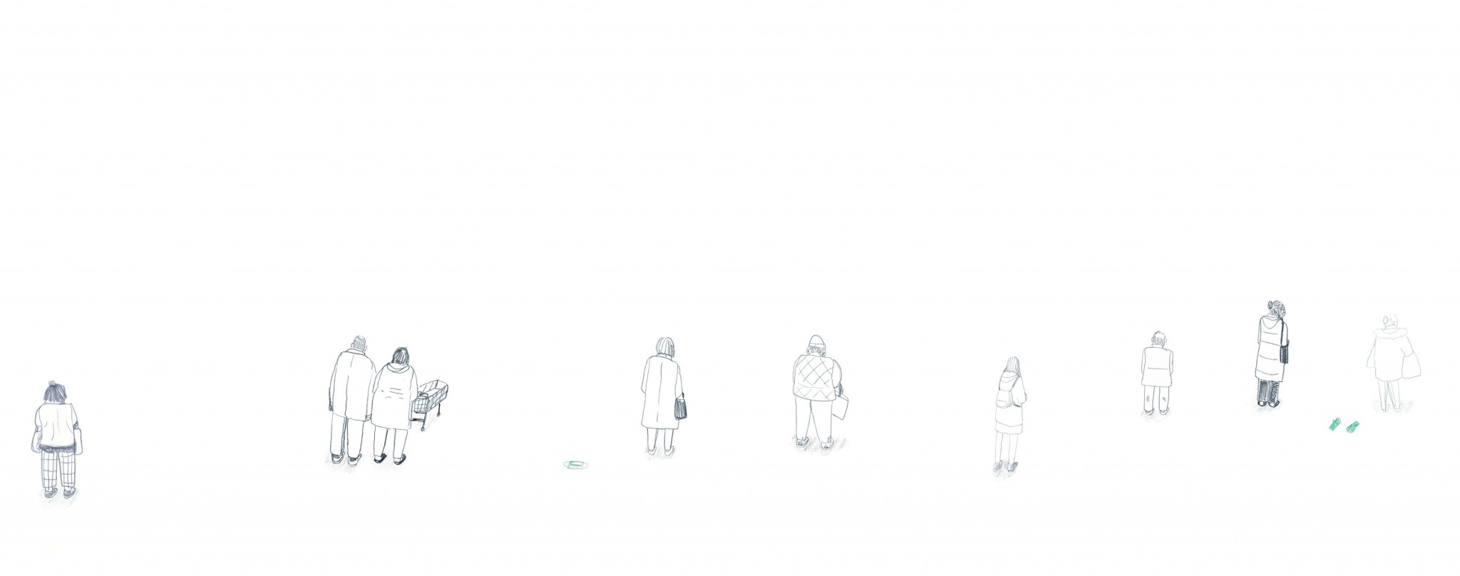 2 Metres Apart is a documentation of people waiting to purchase groceries outside supermarkets across Sheffield. In the final work, Meakin combined her observational pencil sketches into one long queue in photoshop, to reflect the commonality of this unusual experience.