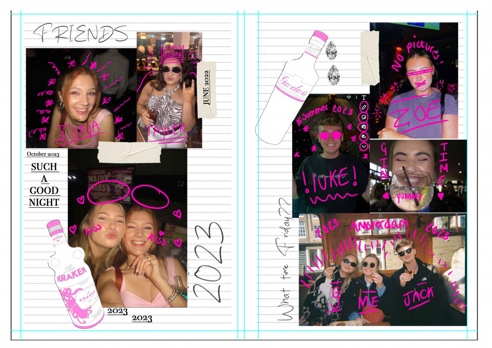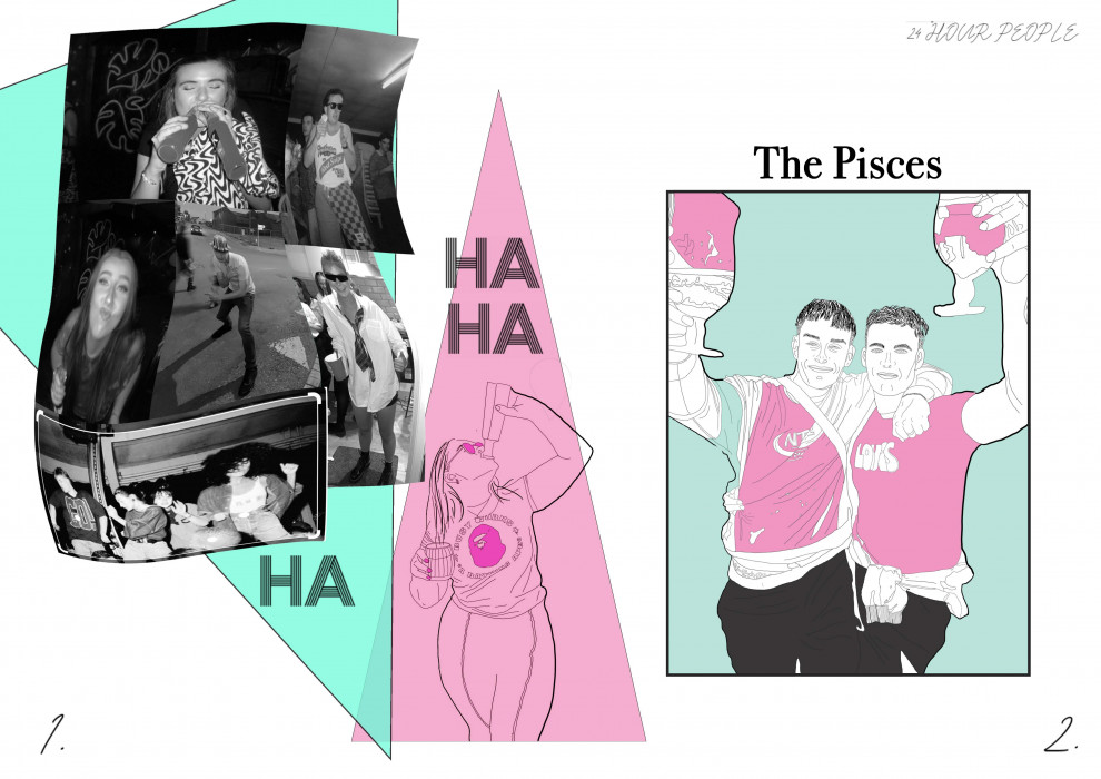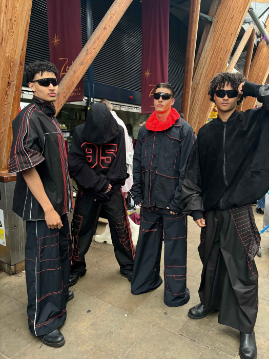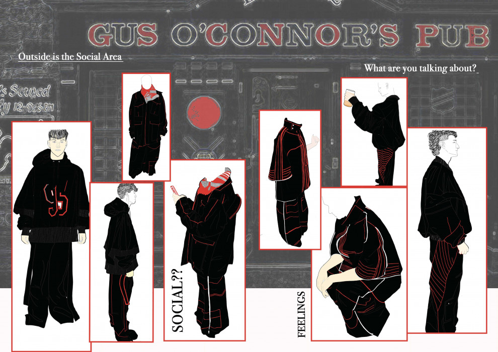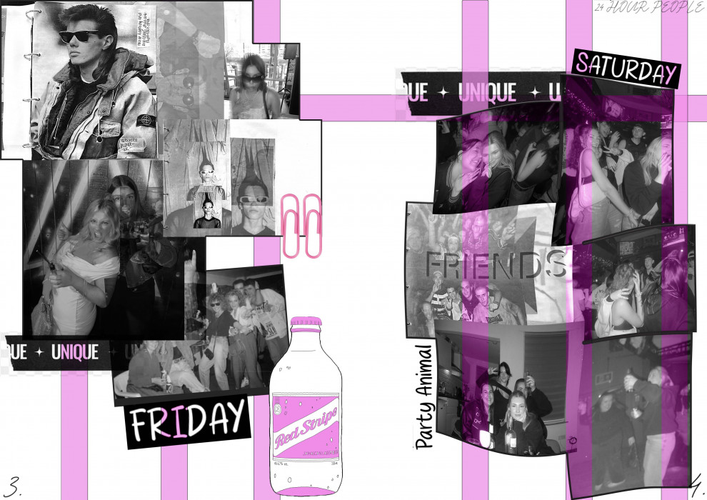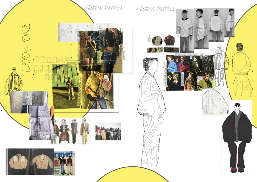 Ellie Williams’ project 24 Hour People, delves into the concept of rave culture spanning the 80s, 90s, and 21st century, exploring themes of drug use and alcoholism. She examines the styling worn at these events, drawing inspiration from the vibrant colours and dynamic lighting depicted in images from that era. Additionally, Ellie aims to incorporate patterns found in the backgrounds of these images into her designs, translating them into material textures and colours. Her collection targets the modern-day raver, blending the desire for aesthetic authenticity with a keen sense of fashion. Designed for versatility, her clothing accommodates the fluctuating temperatures of a night out, transitioning seamlessly from the warmth of the club to the chill of the early morning walk home. Ellie focuses on creating oversized garments with freedom of movement, ensuring ease of dancing and maximum enjoyment for the wearer. Lightweight materials are prioritised, allowing the modern raver to fully engage in the nightlife experience.