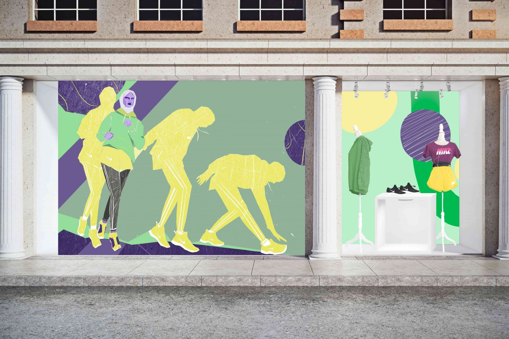 Khozana Omar has incorporated illustration into retail window displays for her graduate project. Omar created everything, from the outfits in the window, to the backdrops, to the illustration of the model wearing the outfits, and mocked them up digitally on to the store window. She analysed different fashion trends and seasons and themed the windows accordingly, choosing bright and contrasting colours and shapes as that is usually synonymous with dynamic movement, for sportswear. Other trends included ‘Punk’ for Winter, ‘70s’ for Summer, ‘Denim’ for Spring, and ‘80s’ for Autumn.