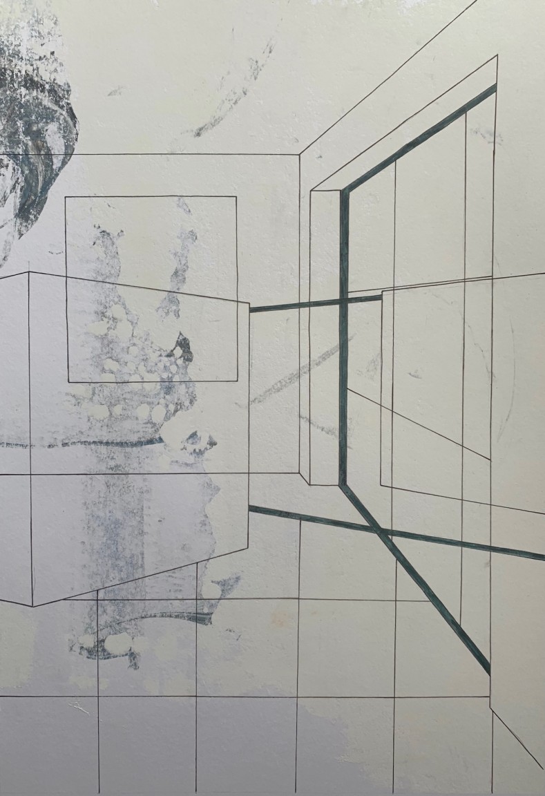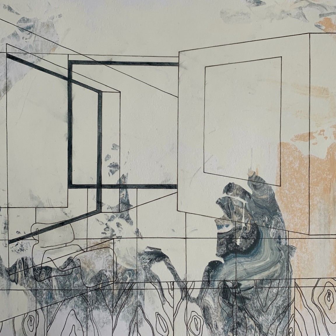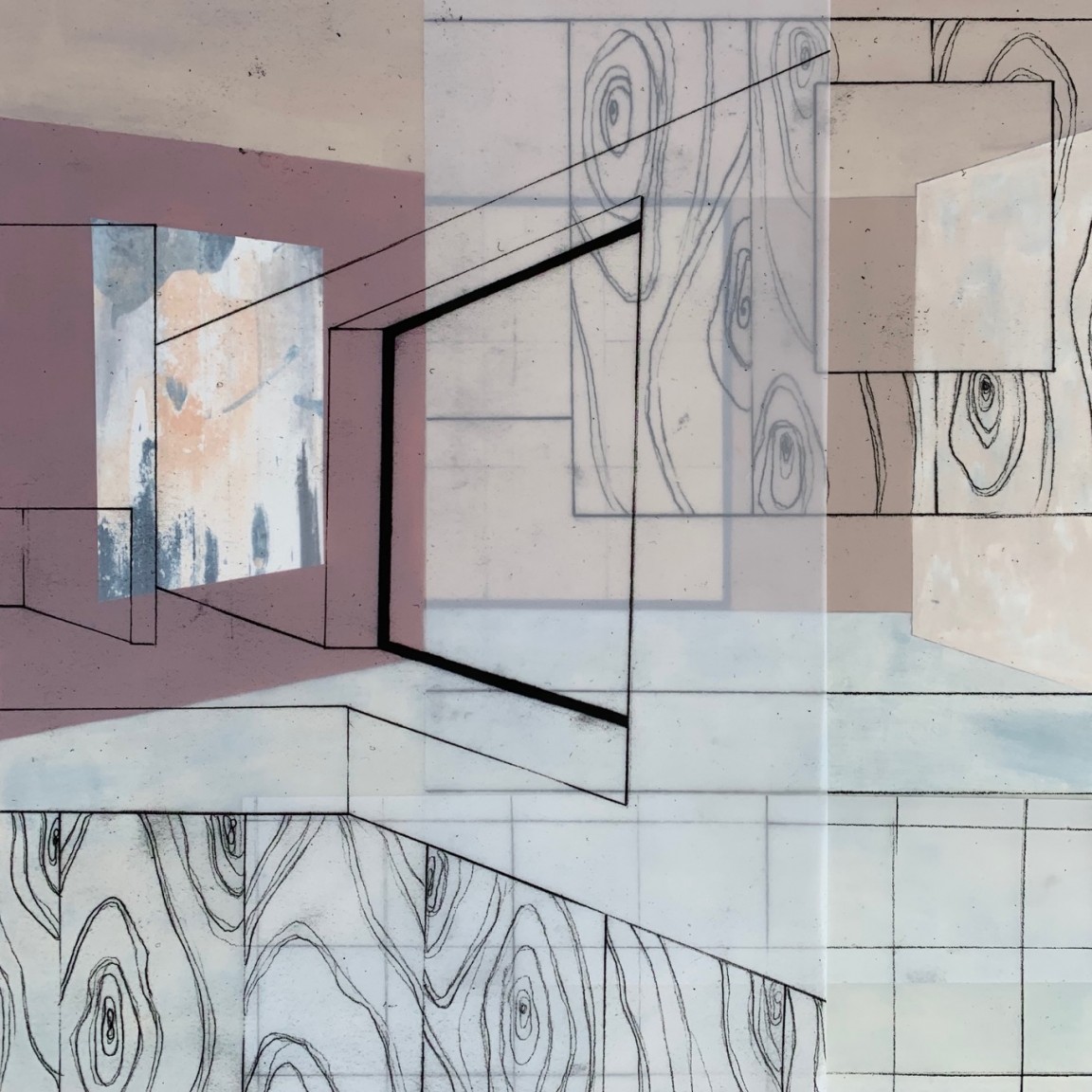 Six resolved, mixed media prints by Cat Etheridge explore and challenge the fundamental features of interior space. Each work is small-scale, with a screen-print foundation surface, and onto this line is layered using fine tip pen, to consider the new space that develops as the different layers, perspectives and compositions communicate upon the surface.