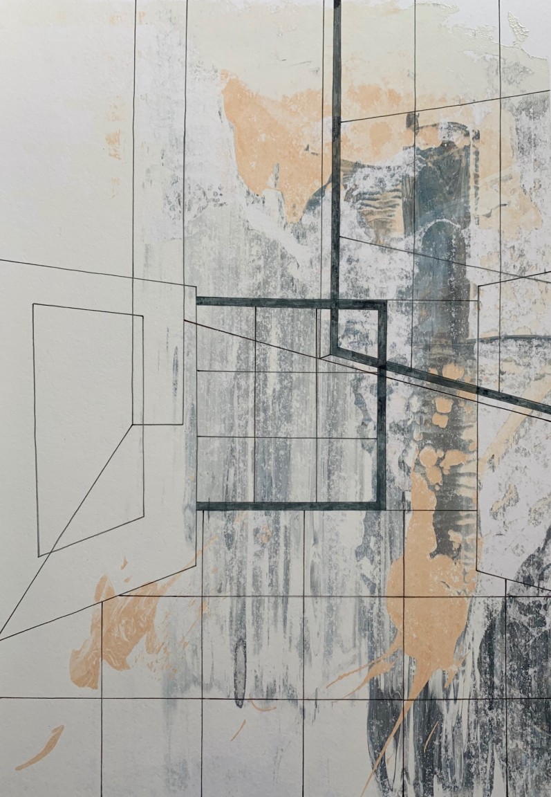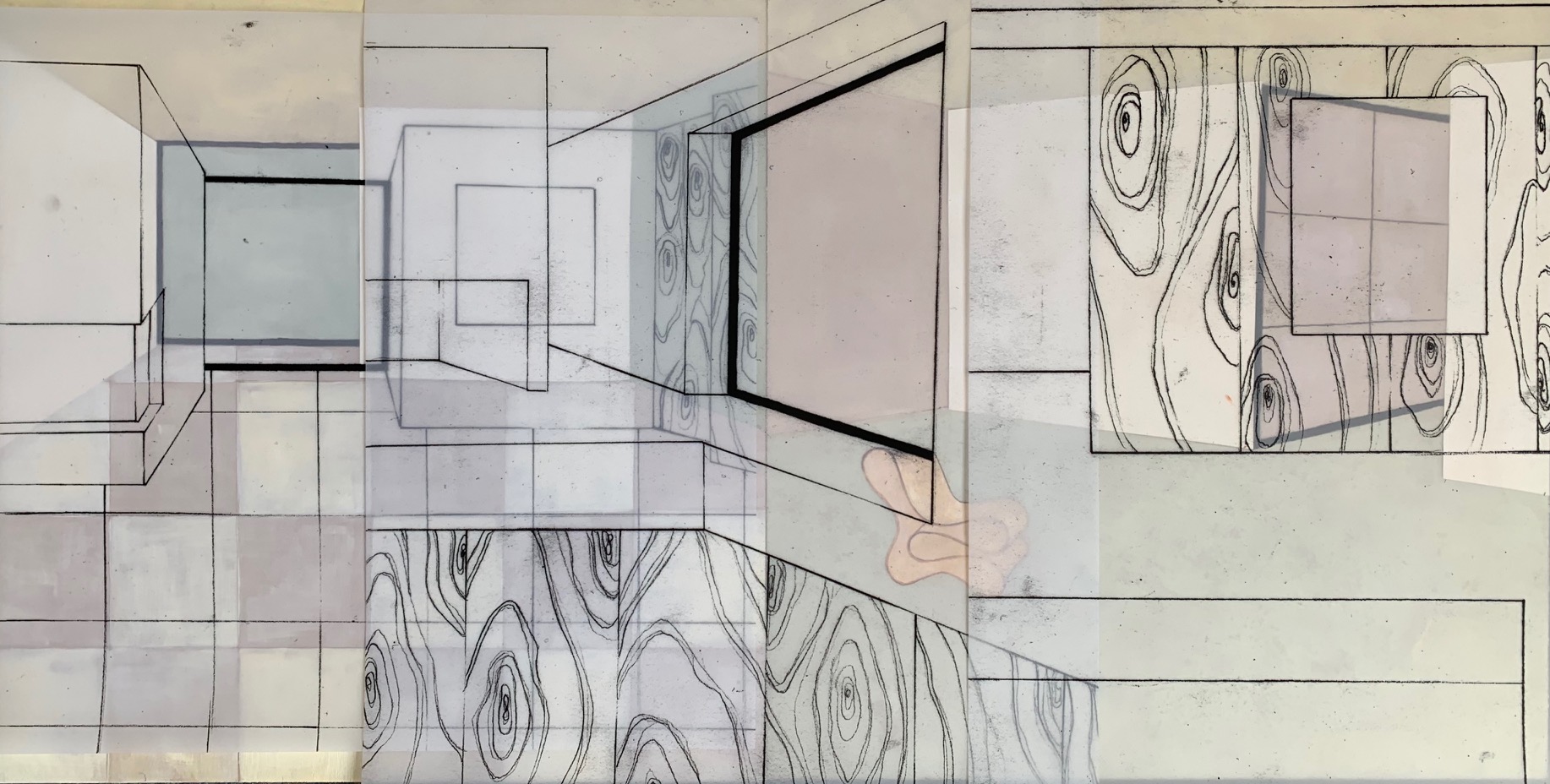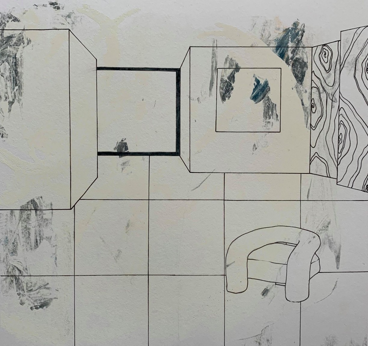 Six resolved, mixed media prints by Cat Etheridge explore and challenge the fundamental features of interior space. Each work is small-scale, with a screen-print foundation surface, and onto this line is layered using fine tip pen, to consider the new space that develops as the different layers, perspectives and compositions communicate upon the surface.