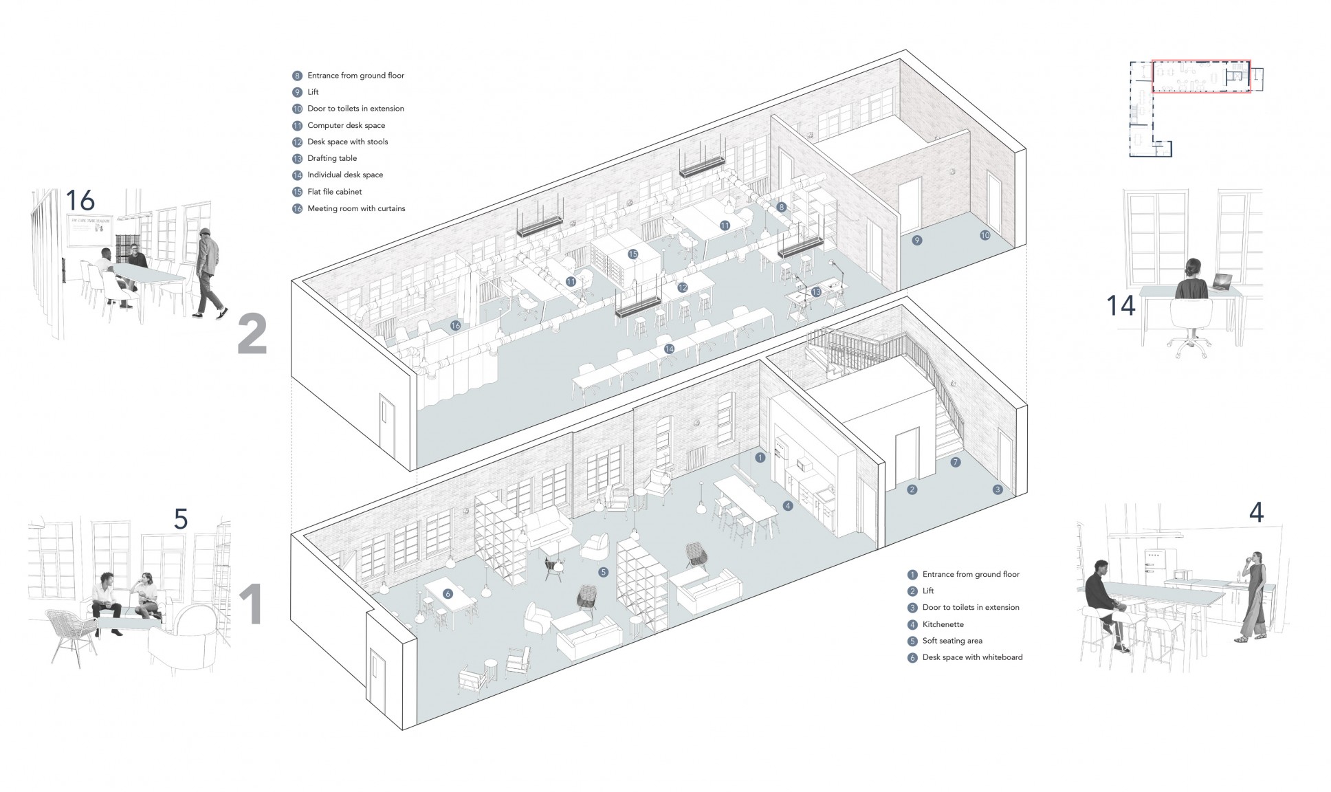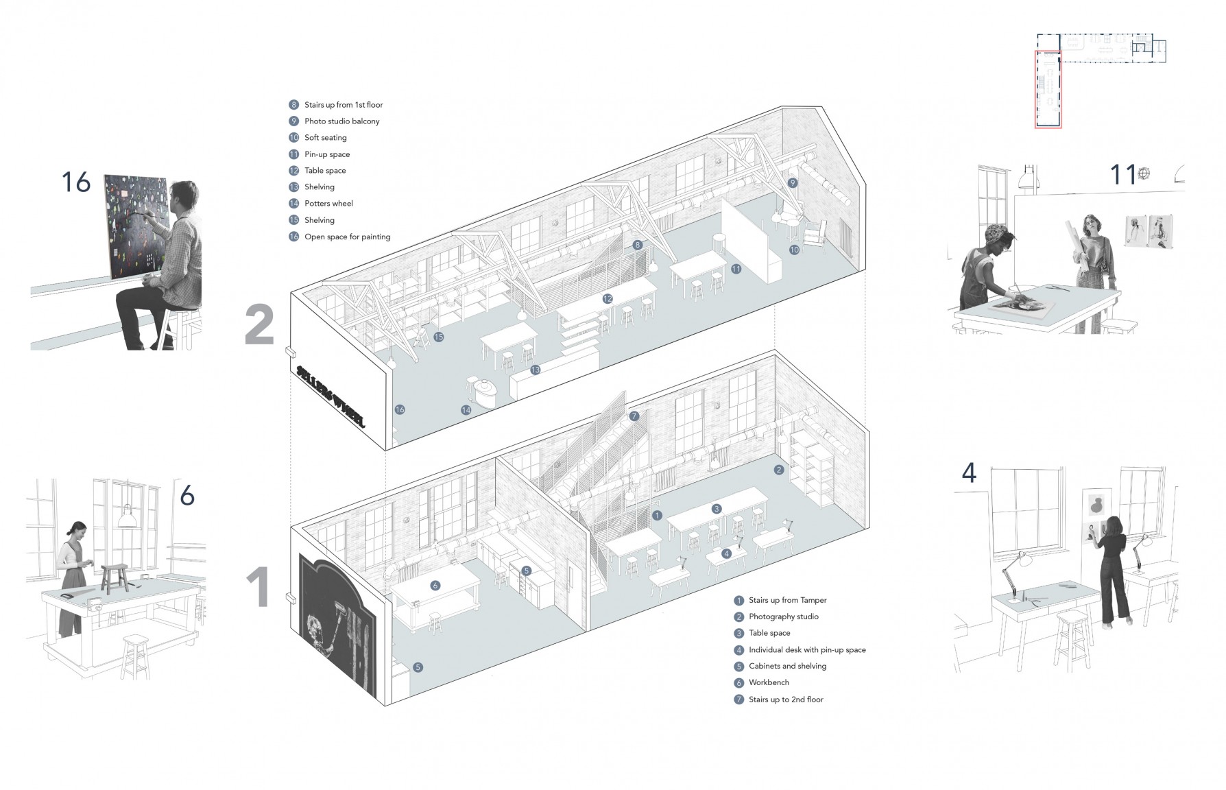 The space is designed for graduates and young professionals, offering a bookable workshop, studio, and desk spaces to house a variety of creative individuals. It is designed as a stepping stone for graduates and young professionals into the creative industry, offering space and equipment to explore and develop ideas.