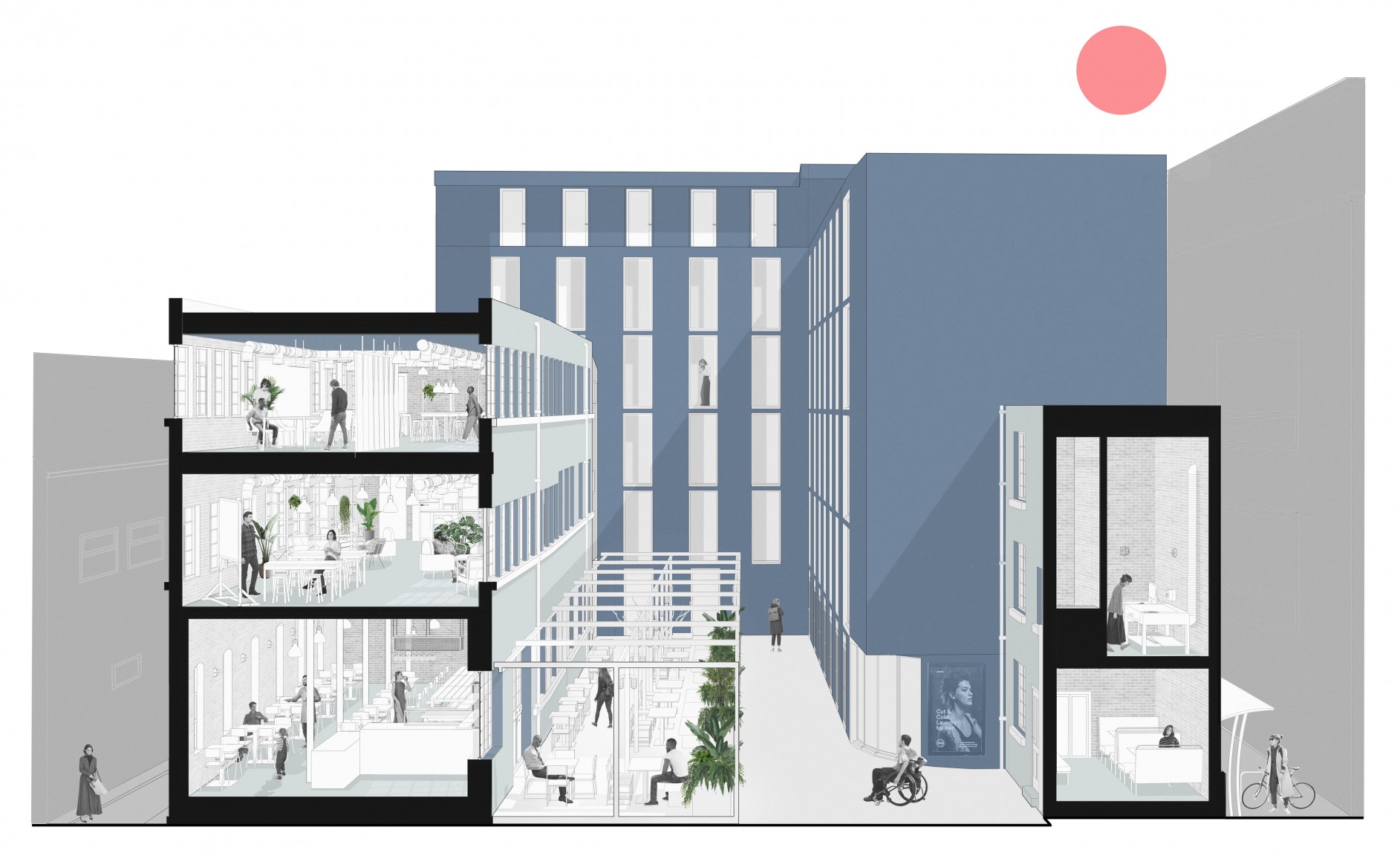 The design encourages collaboration between creatives, based on research of the effects of sustainable office space and Foster’s personal experience through the Covid-19 lockdown, with a lack of access to facilities and a place like-minded people can meet affecting her in particular.