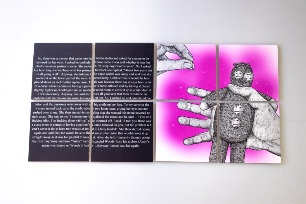 Paul Gregg has produced a body of work that encapsulates some of his own life experiences, from his time as an apprentice tattoo artist. Every person that works in this industry needs to have a particular set of attributes. The first being an artist that has good communication skills, closely followed by being a therapist, that can empathise with the client about some of their stories they tell you.