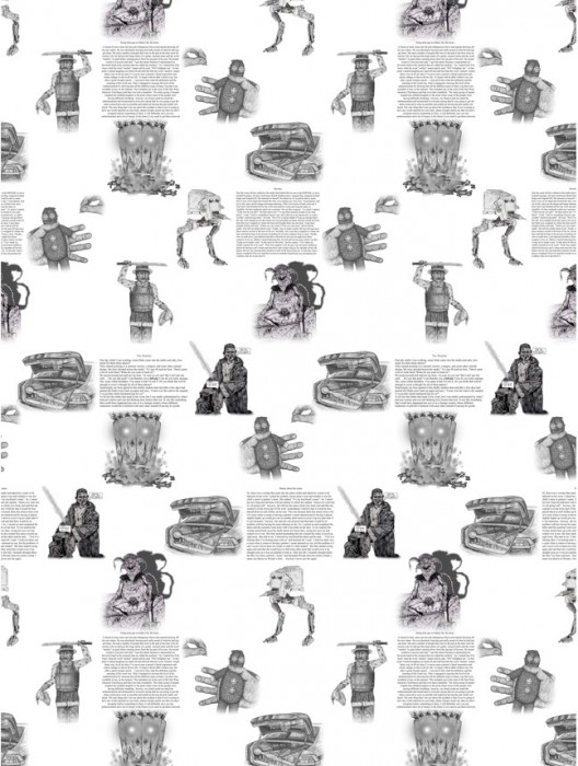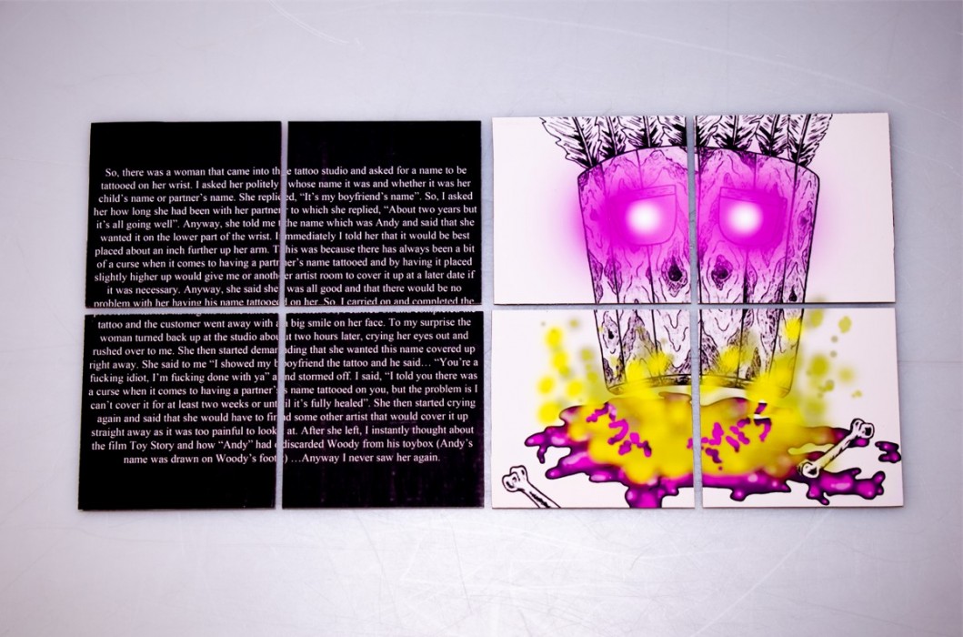 This small collection of stories are true accounts of some of these experiences, that may sound a little bit strange in places, and in some cases, just totally bizarre. The majority of his work are hand drawn visual responses that correlate to these stories, which have been beautifully rendered using just a biro pen on textured art paper. This gives his drawings a highly detailed appearance before adding a digital or watercolour background. The black biro work embodies the skill and passion involved in the creation of any tattoo (most commonly used ink). Purple is symbolic of the carbon stencilling used for the transference of designs onto the skin, and the yellow for the initial sketch lining with sharpie pens when starting any freehand design work that gives insight to his palette choices.
