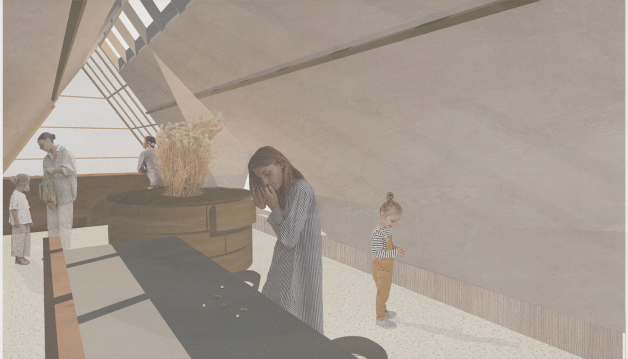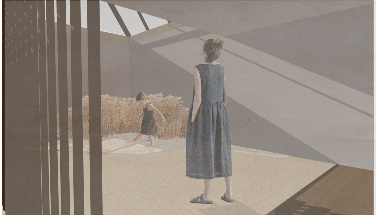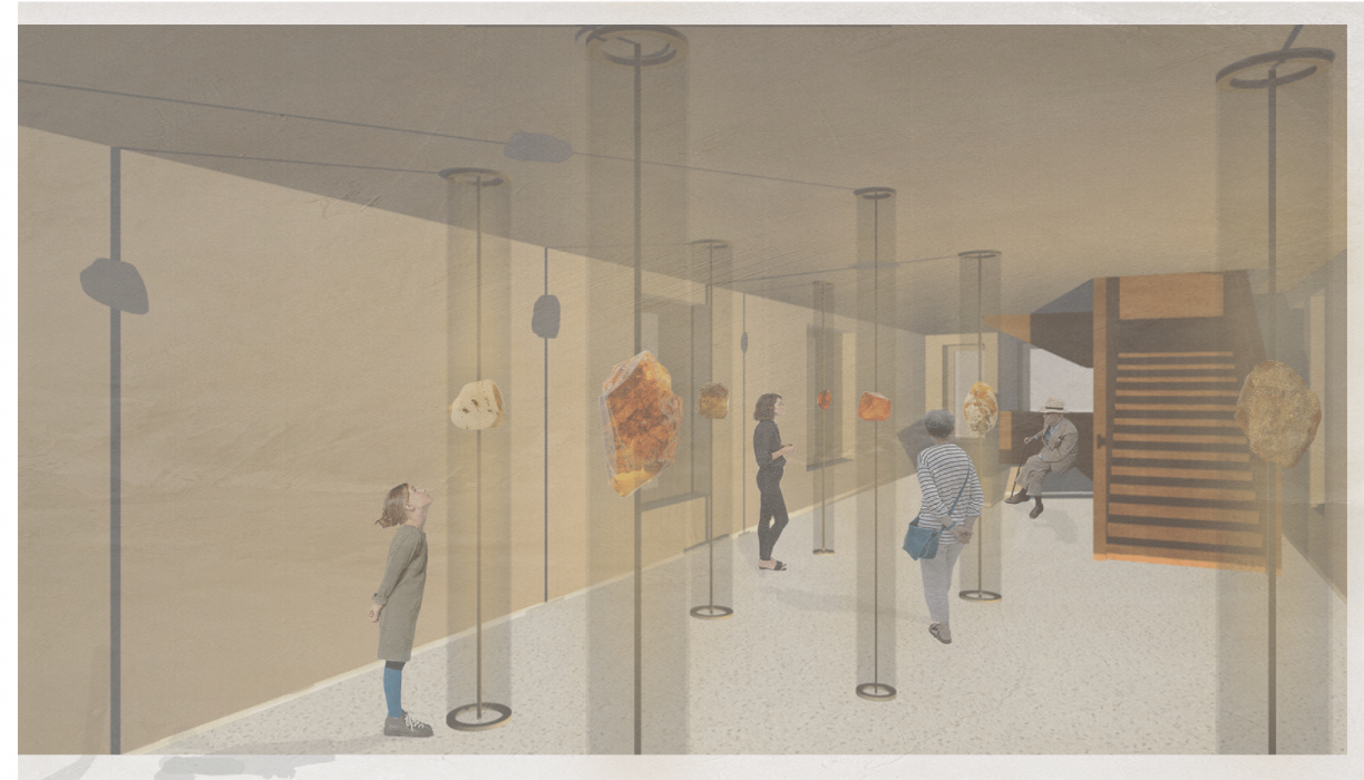 Rapoport’s proposal features ground floor with reception, a seating area underneath the stairs and a café area allowing people to step into the start of the journey. As the stairs take people to the first Oasis experience showing where the Amber comes from, followed by the Amber tube experience showing different types, shapes, and colours of Amber, adding the Sand Pit experience to allow people to find the Amber themselves and take the found pieces to the workshop to unravel creativity and produce unique art piece. All the experiences provide visual and sensory learning attributes suitable for multi-generations with various abilities. Within the building the explorer can feel free and comfortable by taking stairs or lift to manoeuvre easily and wonder around, finding a space for your own personal reflection whilst emerging into experiences.
