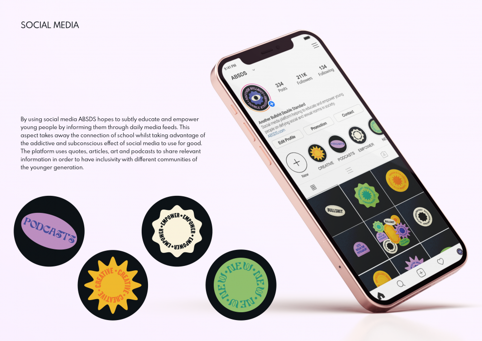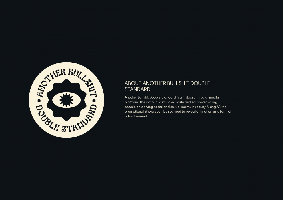 Another Bullsh*t Double Standard is a social media platform which aims to educate and empower young people in defying sexual double standards in society. Using augmented reality (AR), the stickers can be scanned to link phones to the ABSDS main instagram account, as a form of promotional advertisement. By using social media, Campbell’s ABSDS hopes to subtly and visually communicate, by informing people on the platform with daily media feeds. This aspect takes away the connection of school, whilst taking advantage of the addictive and subconscious effect of social media, to use it for good. The platform uses quotes, articles, art, and podcasts to share relevant information in order to provide inclusivity with a range of different communities of the younger generation.