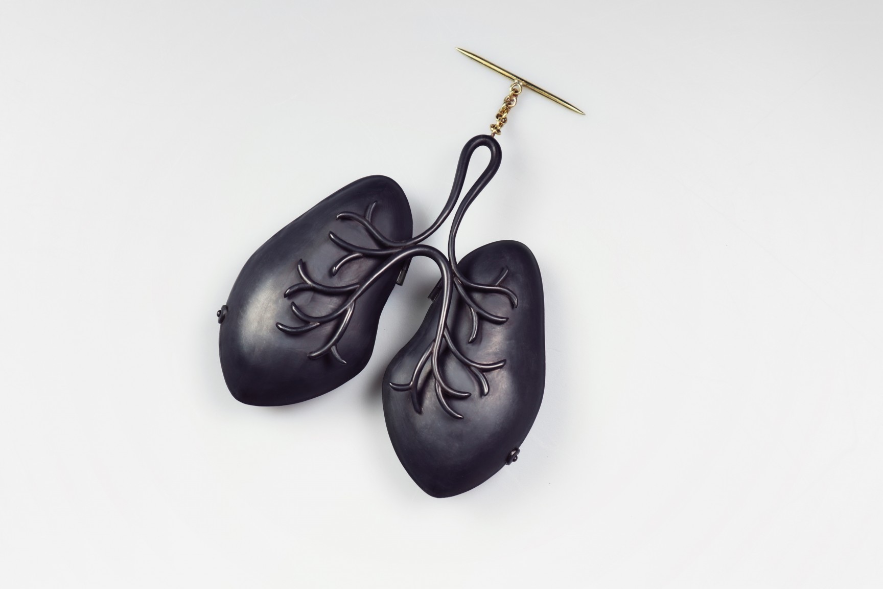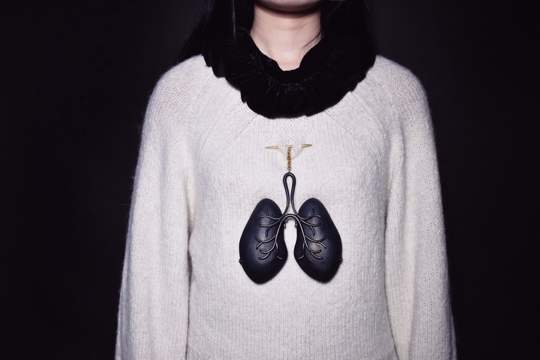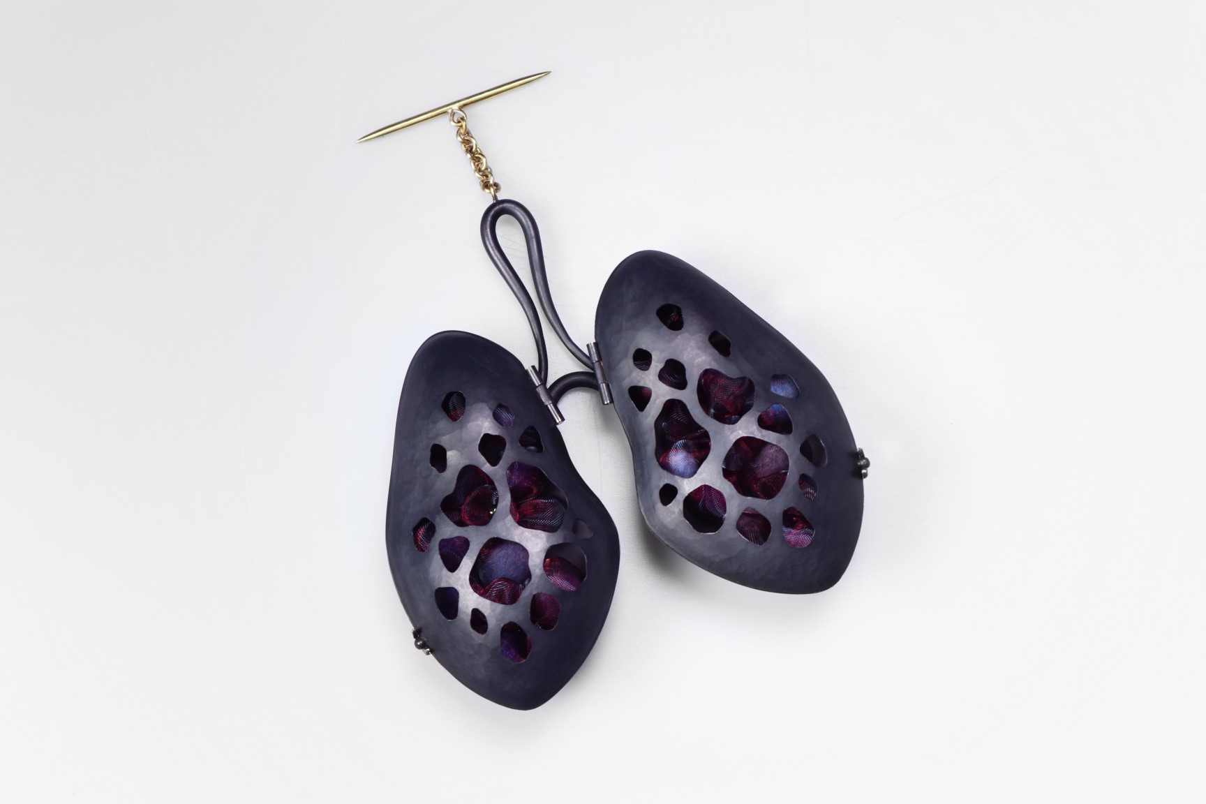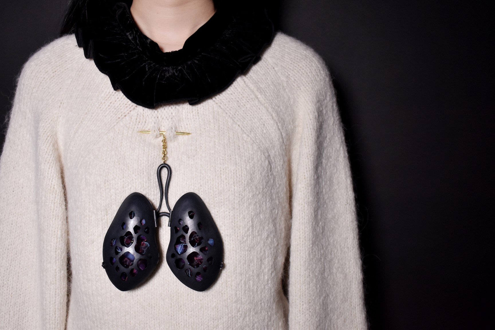 Yutong Lu uses contemporary jewellery in dialogue with its audience to explore the impact of anxiety on body organs, from two aspects: as the jewellery is seen and as it is worn. Anxiety: Aggression and Resistance is a brooch which can be worn in two ways. One side represents ‘resistance’ with shield-like metal lungs a metaphor for combat and struggle against anxiety. On the other side, the hollowed out metal, filled with ‘anxiety viruses’ evidences the erosion caused by anxiety representing the concept of ‘aggression’.