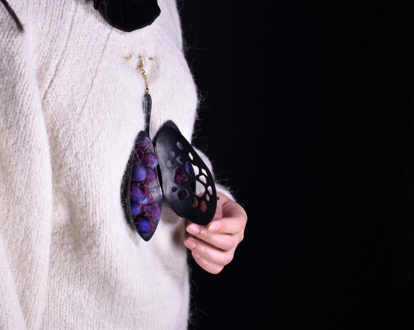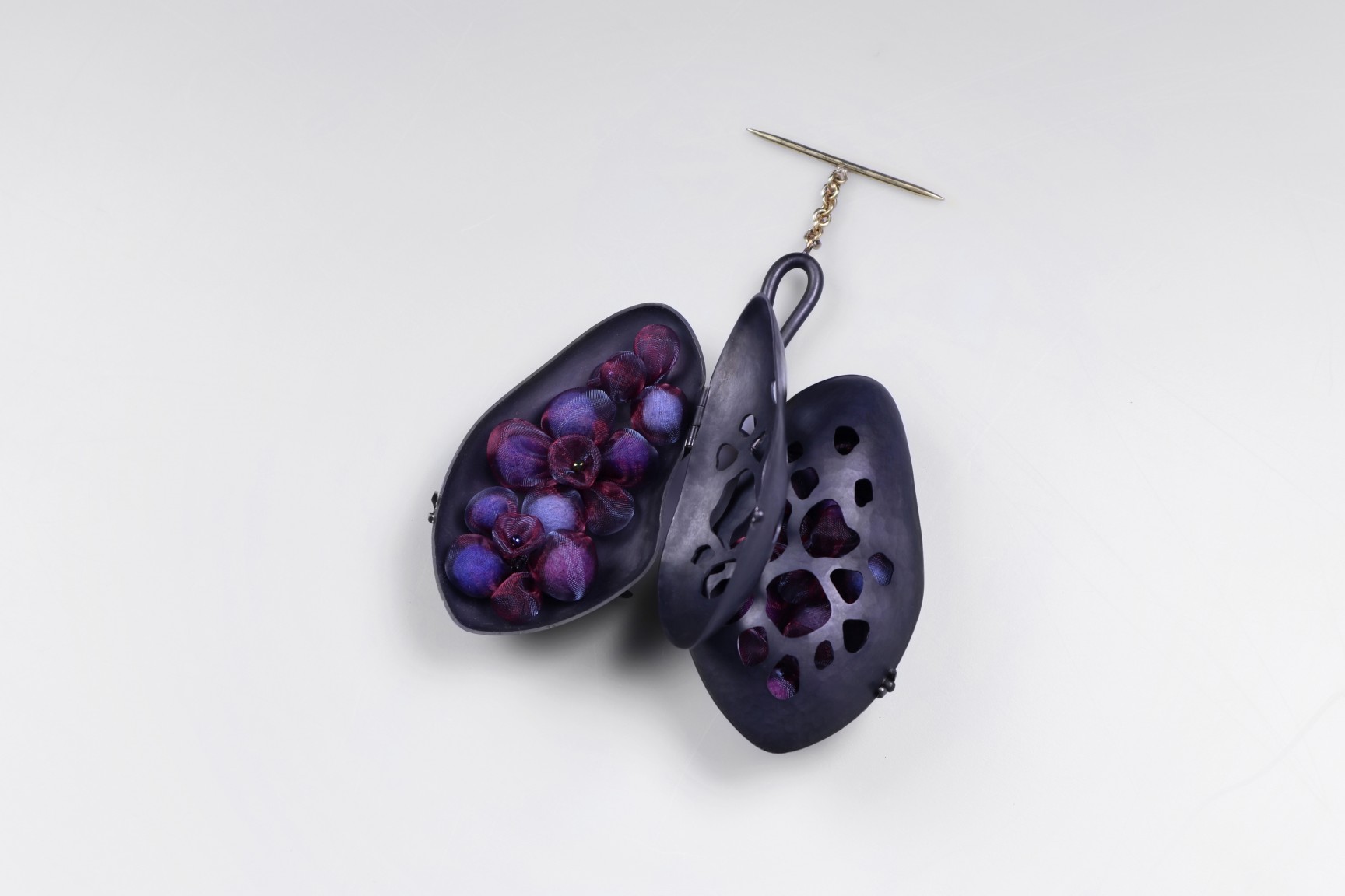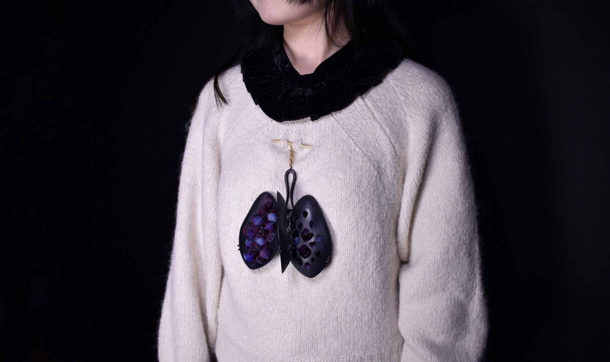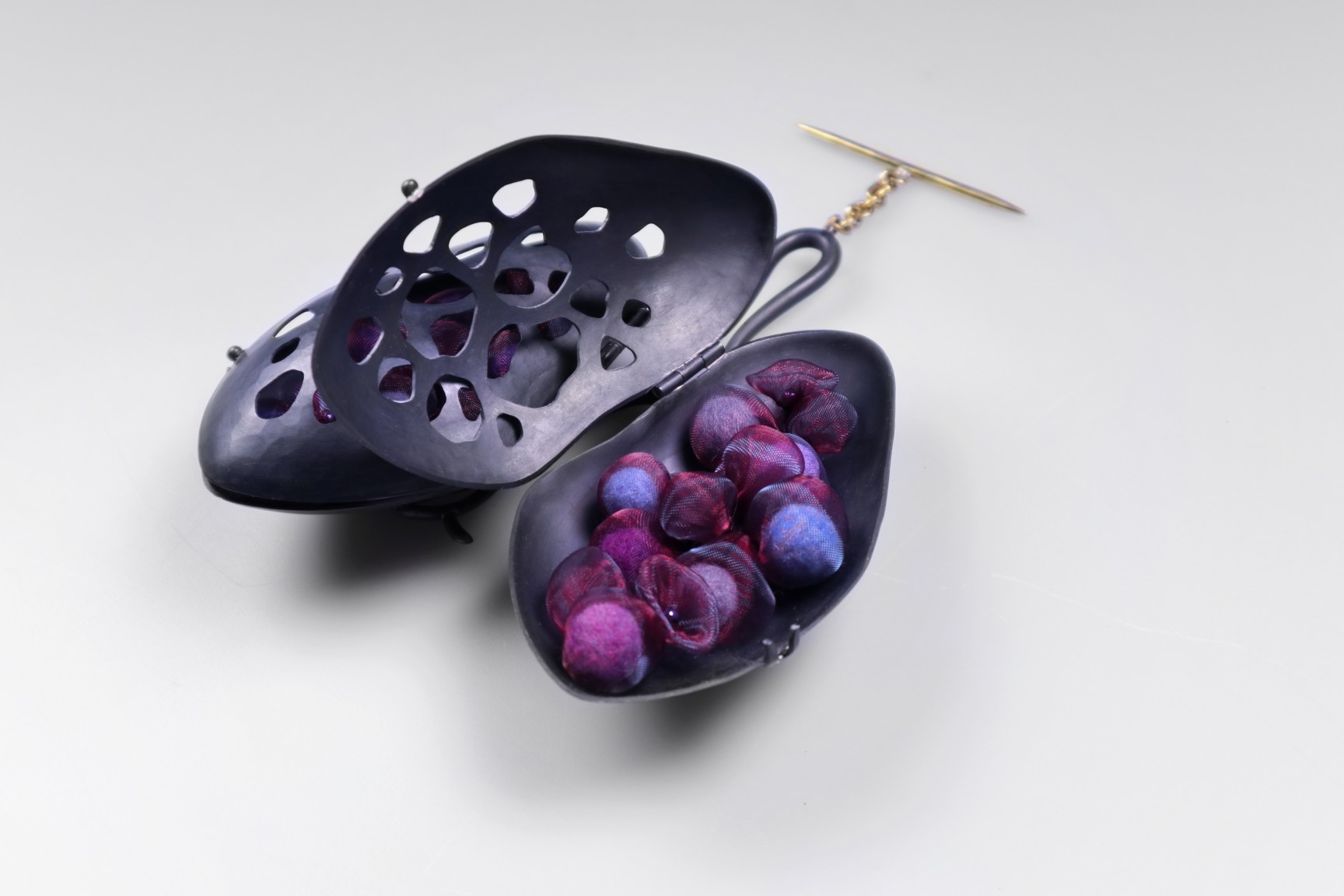 Yutong Lu uses contemporary jewellery in dialogue with its audience to explore the impact of anxiety on body organs, from two aspects: as the jewellery is seen and as it is worn. Anxiety: Aggression and Resistance is a brooch which can be worn in two ways. One side represents ‘resistance’ with shield-like metal lungs a metaphor for combat and struggle against anxiety. On the other side, the hollowed out metal, filled with ‘anxiety viruses’ evidences the erosion caused by anxiety representing the concept of ‘aggression’.