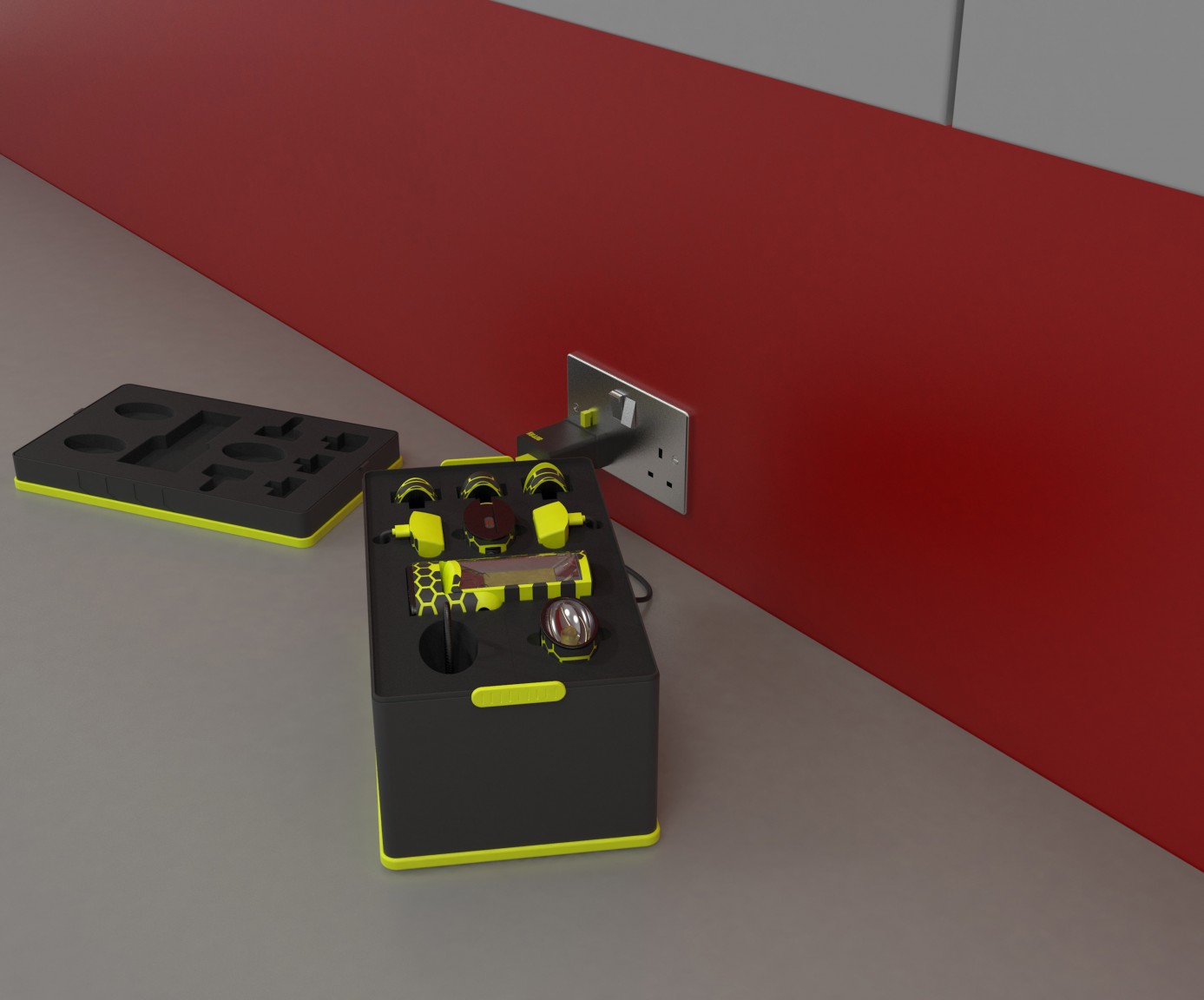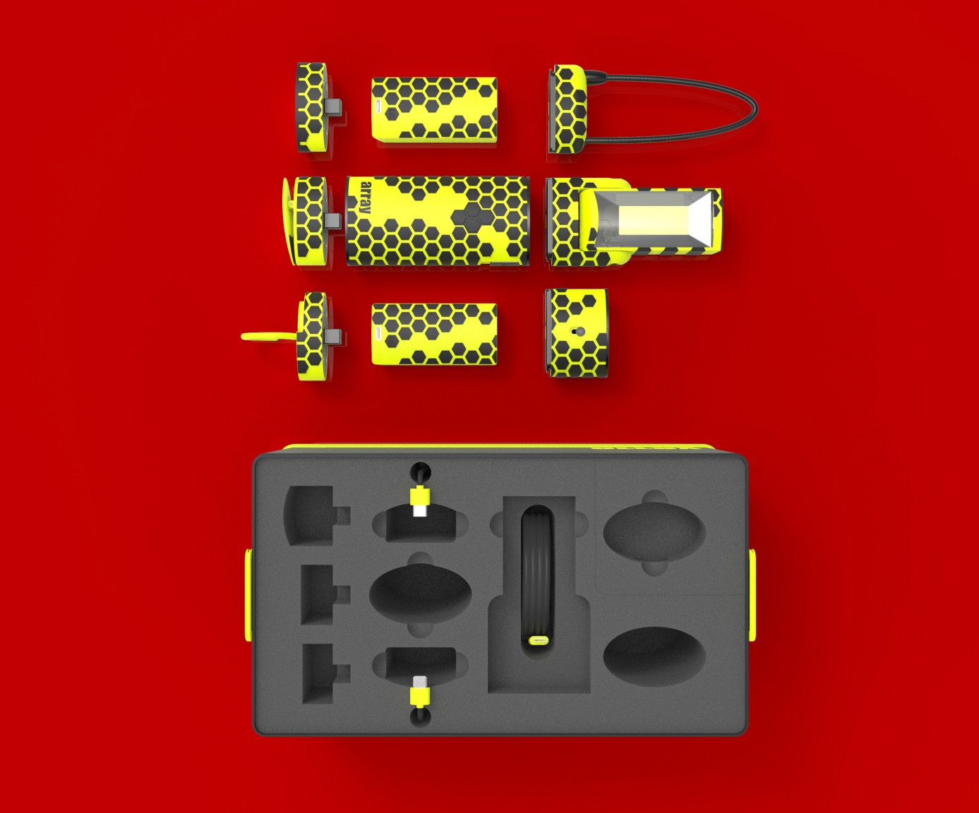 The kit consists of a device with 2,4400 mAh Li-Po rechargeable battery packs, a tilting flood light incorporating brightness adjustment and a 36 chip COB LED. The kit also utilises a focus adjustable torch and a flexible task lamp for lighting hard-to-reach areas. The array kit features 3 base fixtures: a magnetic base, a swivel hook base and a rotating lip base to aid with workflow and safety in what can be a very dangerous environment if poorly lit. Array is charged in a storage box using a conventional USB Type C connector to make charging convenient. The box is padded with polyethylene foam which will stand up to the rigours of a workshop environment.
