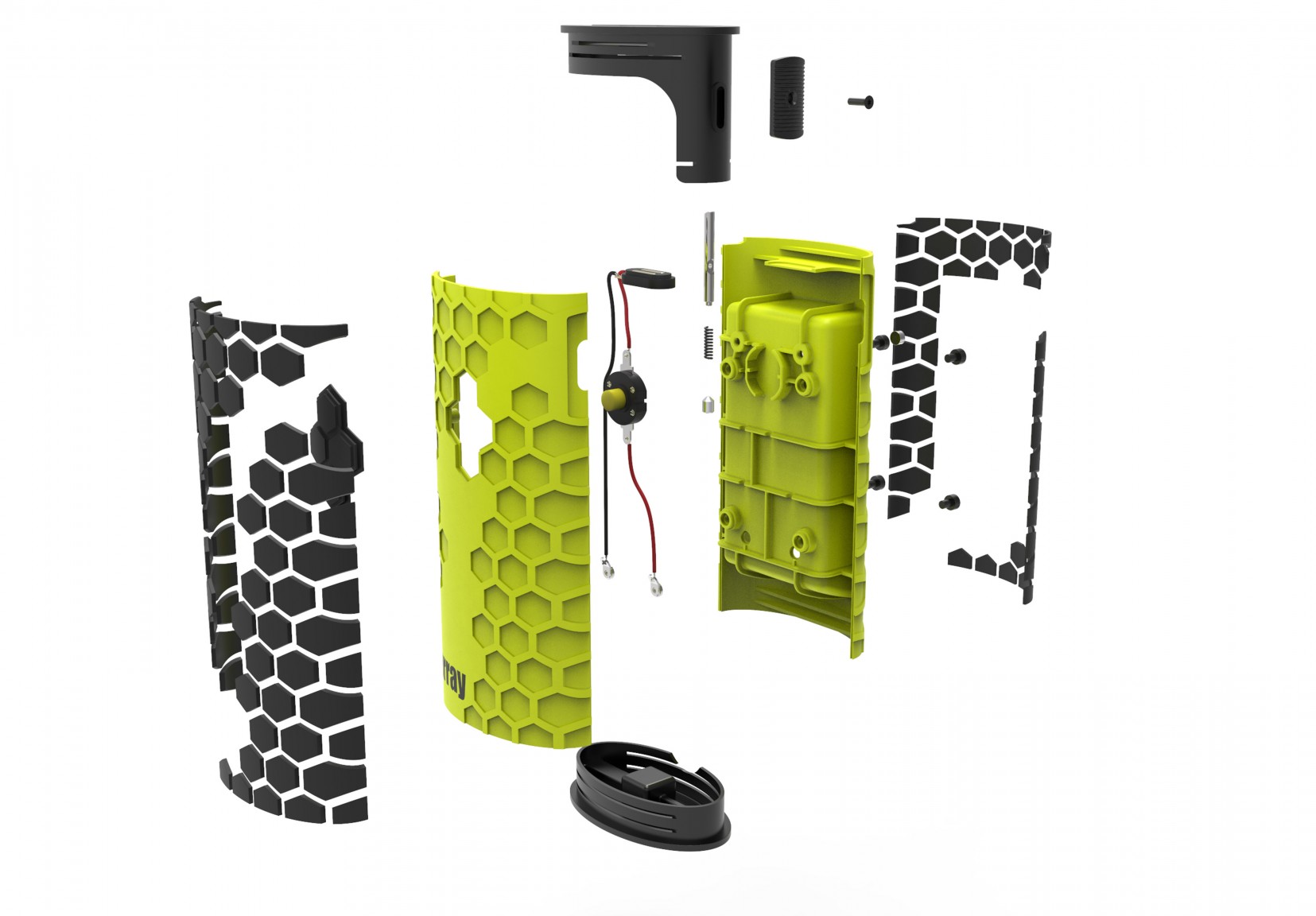 The use of materials was of great importance for Array as the lighting system would be used in harsh workshop environments and exposed to oils and other chemicals. Arnitel TPC is used for all over moulded details for its chemical resistance and relatively high heat resistance. Nylon PA66 GF30 is used for all main body components for its rigidity and drop resistance.