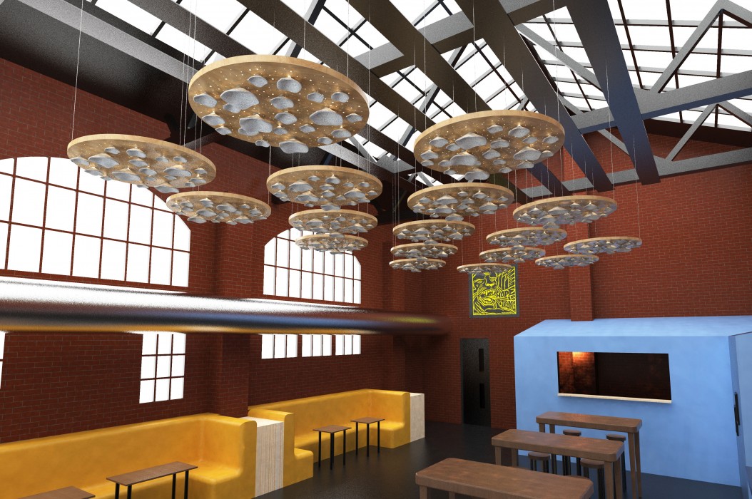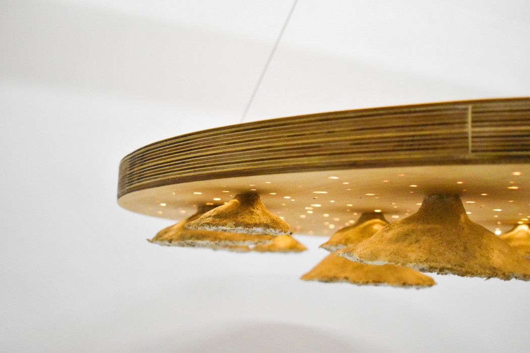 The notion of Aura is to have multiple panels placed in large commercial spaces to create an impactful display. Pina; a Mexican style restaurant in Kelham Island, Sheffield was chosen as a suitable location – having an ideal building for this type of installation to be fitted. The intention behind placing it in a public space was to increase awareness of mycelium and its brilliance as a sustainable material. As fungus is often seen as something that’s unclean and unwanted, this is a way to change peoples’ perception; to show that fungus can be fascinating and has endless possibilities for the future of design. It is one of the most revolutionary materials in the upcoming bio-based industry, and is already being utilised to replace leather, plastic packaging and more.