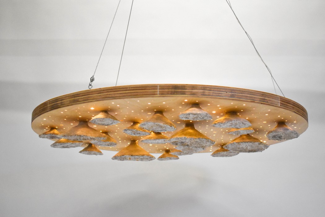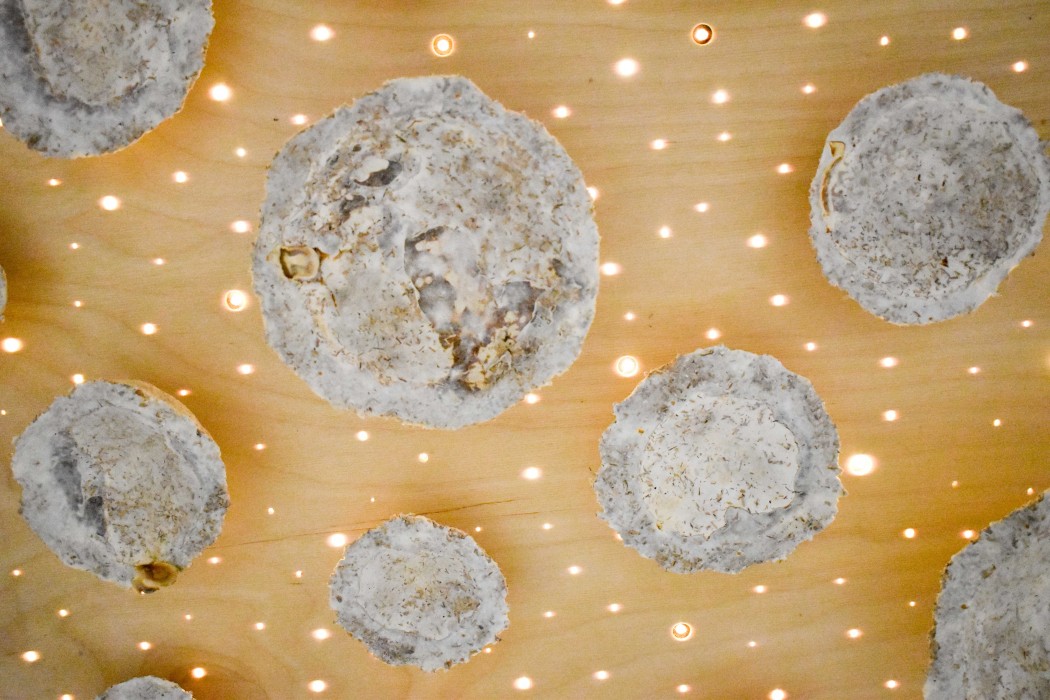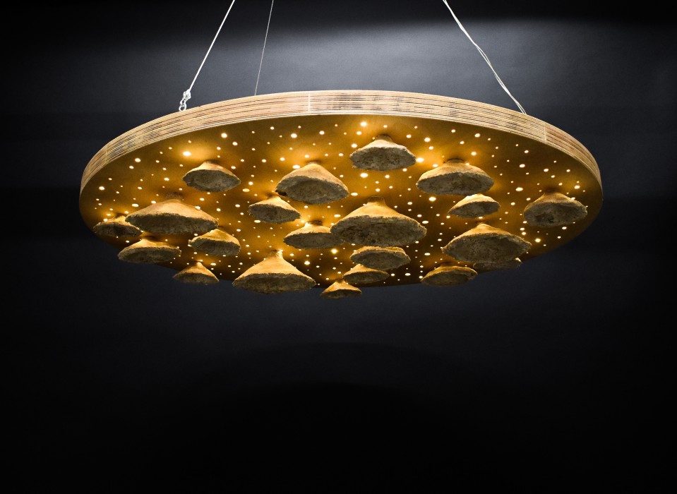 Aura is a sustainable light installation using mycelium attached to a large wooden panel that creates a star light effect, backlighting the mycelium and accentuating its beauty.