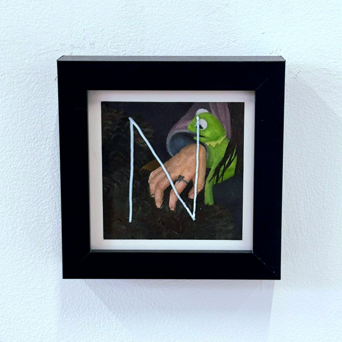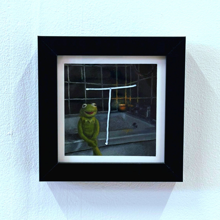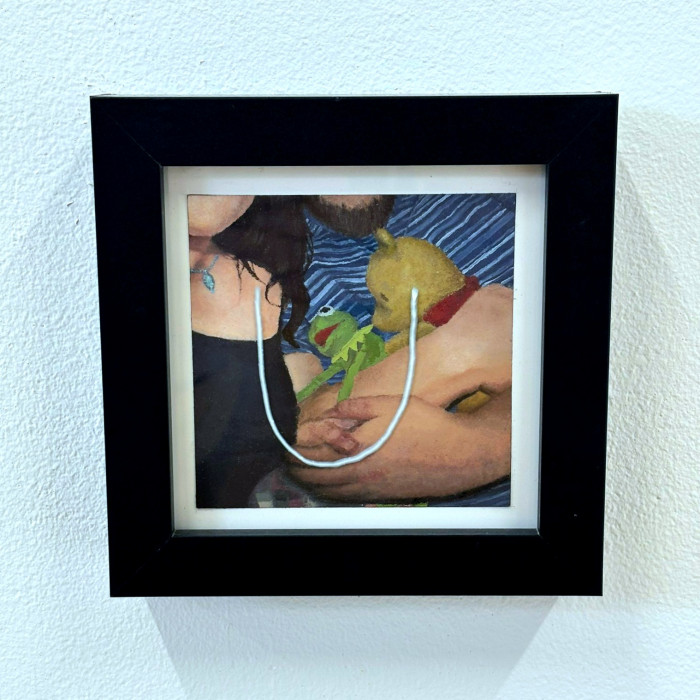 Mia Sky Cooper’s AUTONOMY is a series of 8 miniature oil paintings that depict some of the steps taken back to living an autonomous life after leaving an abusive relationship. From building support networks to therapy sessions, these paintings act as windows into real moments from the artist’s life. Previously prohibited activities, such as expressing her alternative sense of style, are now safe to enjoy. Realism painting on such a small scale requires an intense level of attention, an intimate understanding of each detail. To be fully experienced by a viewer requires a similarly intimate moment between themselves and the artwork, an autonomous decision that is theirs to make. AUTONOMY is hand written across the work, which feels like a protest against the life that she had been forced to live – the artist is taking the power back into her own hands. There is a harsh juxtaposition between the dark subject matter and the comic relief brought to the pieces by her childhood teddy, Kermit. Cooper says: “Kermit held my hand through most of my first experiences. I felt it was important to have him by my side as I learn to live freely once again”. There is a sense of hope that is captured; one that may encourage other victims that autonomy is worth fighting for.