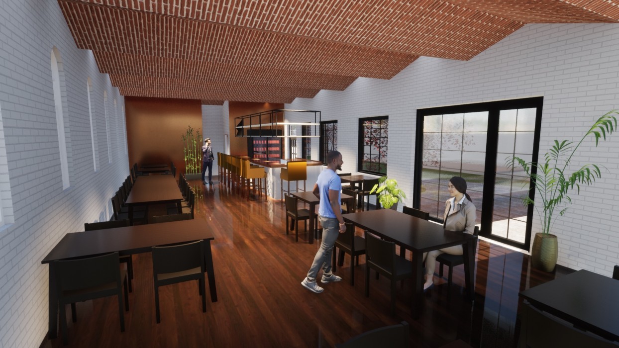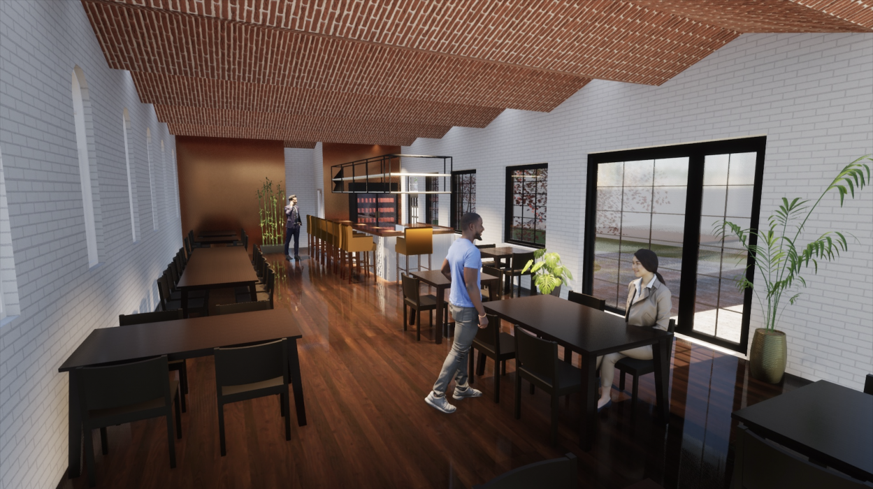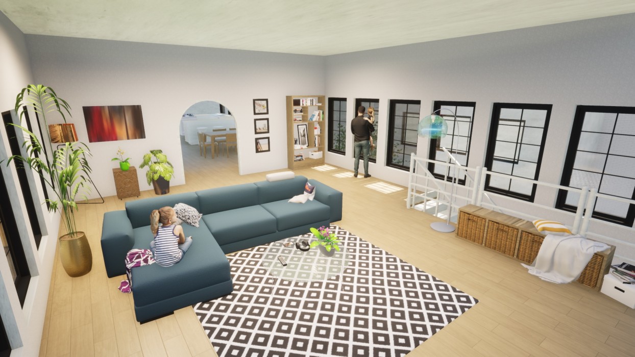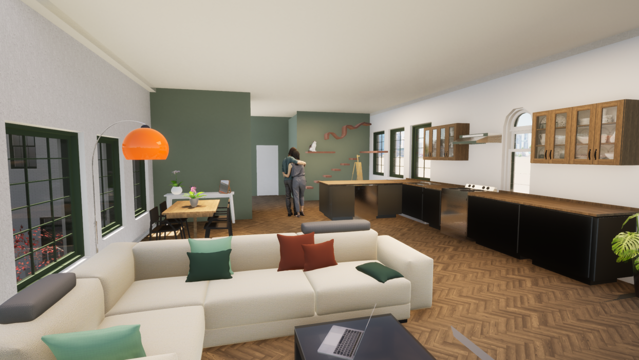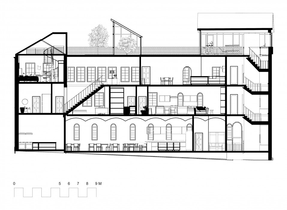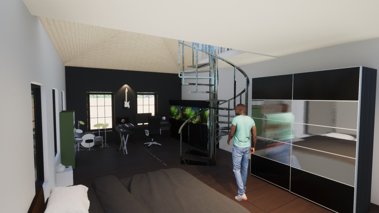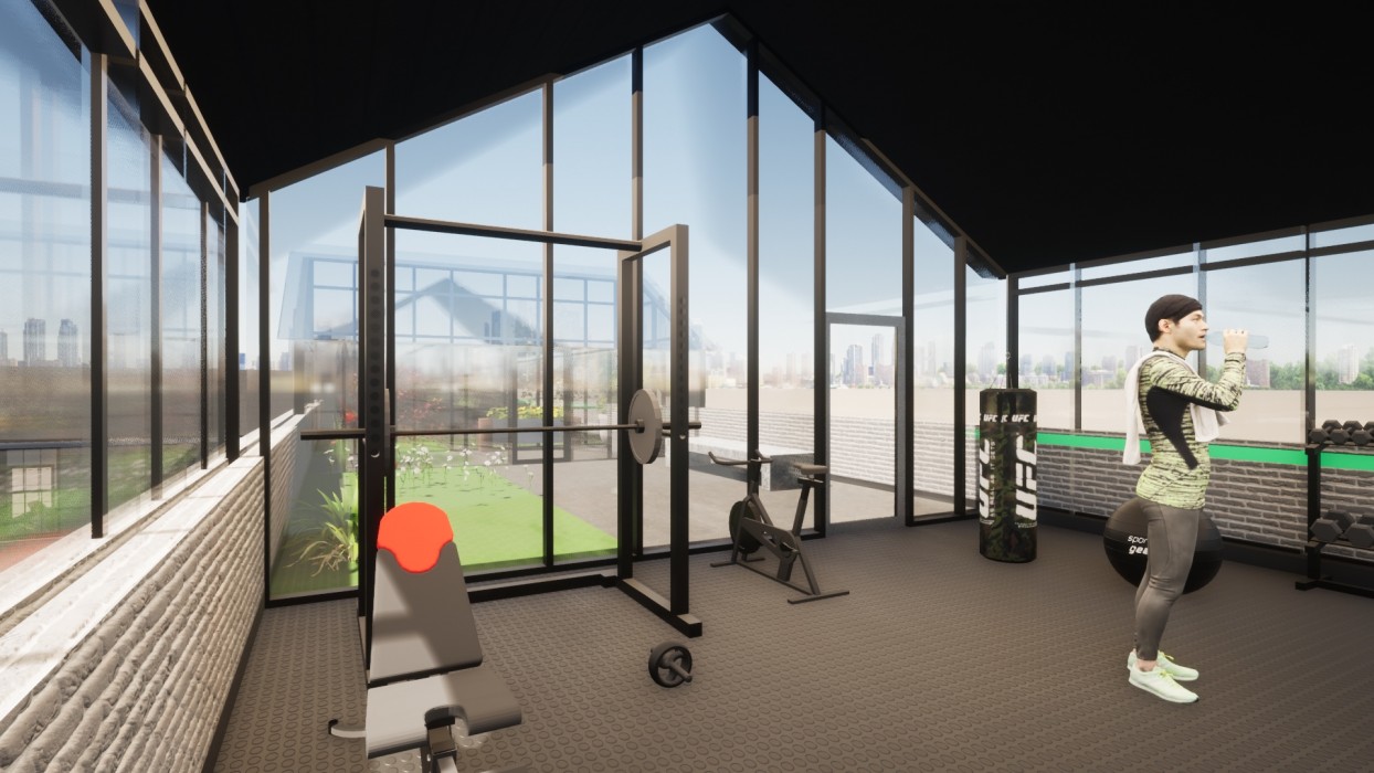 Radziunaite’s concept consists of maintaining the existing purpose of the ground floor, which is currently a hospitality space open to the public, however, reinterpreted as a high-end bar to compliment the exclusive apartments above. In the remaining space are three apartments accommodating a variety of clients with their own preferences and lifestyles, these include a sporty family of four, a cat-loving couple, and a music producer. From these clients, she created three different briefs, with client profiles, which specified their own personal needs and desires for their apartments to accommodate. To create a community within the living space, Lija also designed a communal garden including a greenhouse, and an indoor gym on the rooftop which enriches what the building offers and supports the client briefs.