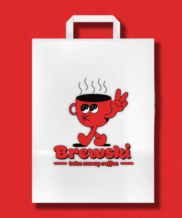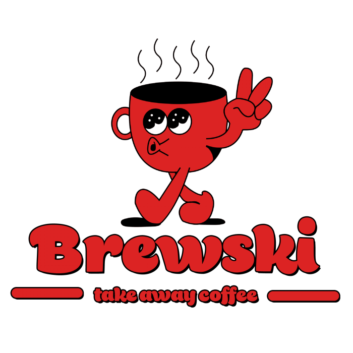 The logo for Brewski is a walking and whistling cup of coffee. The whole aesthetic is very illustrative and attention-grabbing. It differentiates itself from other coffee shops by not using any of the browns and green colours which are becoming trendy in today’s world.