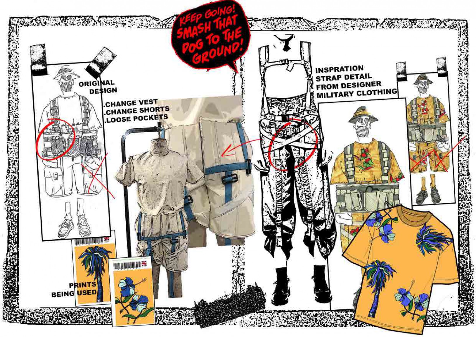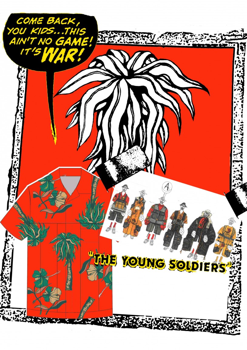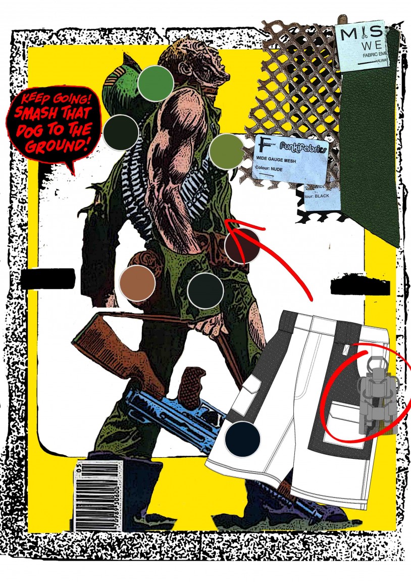 Jessica Anderson’s graduate collection gives military clothing a crazy twist. MOLLE pouches, hydration packs, utility bags and utilitarian detailing are subjected to a blast of colour and print from the mind of Hunter S Thompson. Anderson’s interest comic book art is a clear influence as is her reflection on the brands Carhartt and Stone Island, but the collection is very much her own