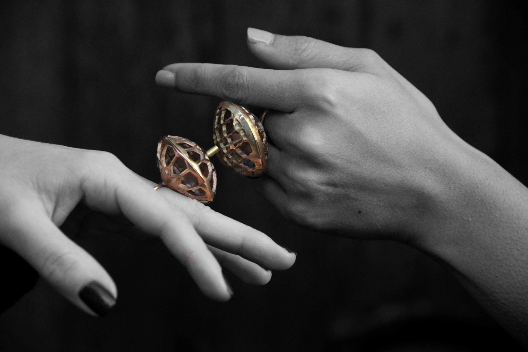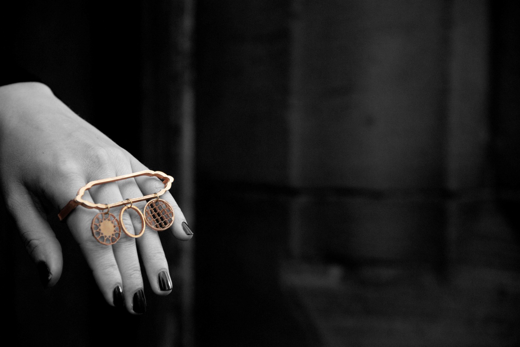 A three-layered detachable and rotatable ring, formed of two plates with a mirror between which reflects the cutwork design of the upper and lower plates. Indian and British colonial architecture inspires the patterns in both plates.