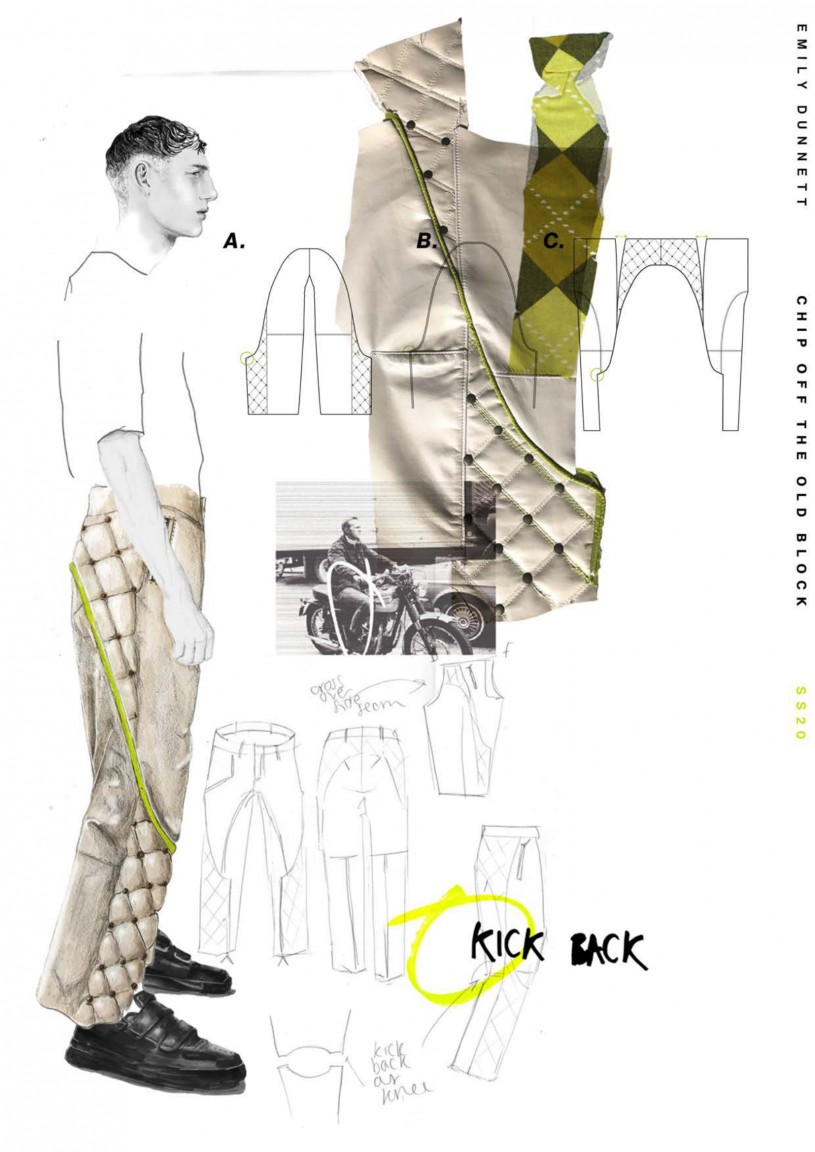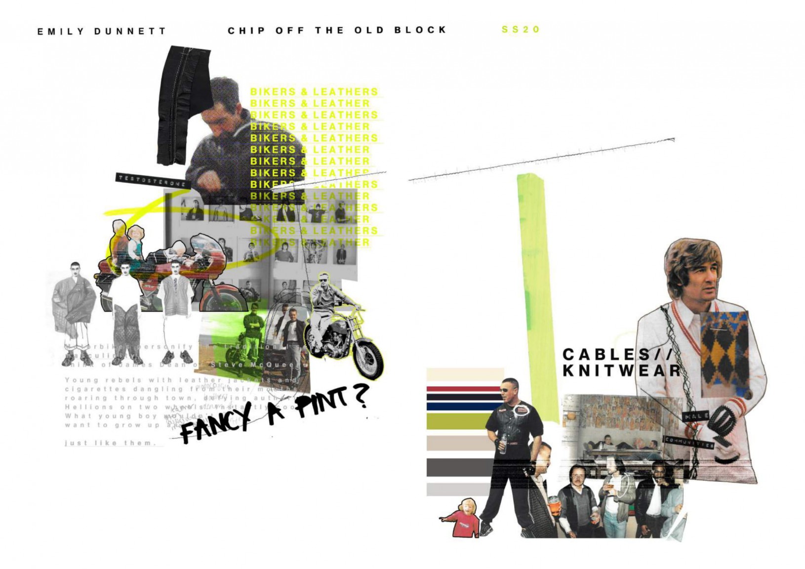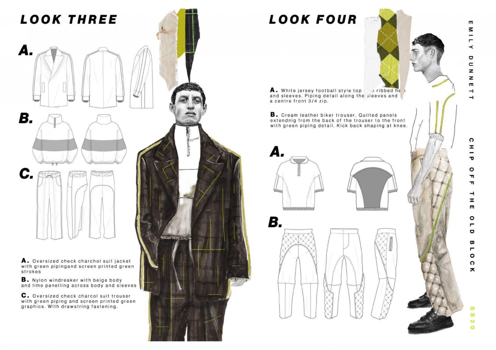 Masculinity, the relationship between father and son and the comfort men find in communities are explored by menswear designer Emily Dunnett’s Graduate Collection, Chip Off the Old Block. This six look capsule collection, features leather work, tailoring, sportswear elements and graphic screen printing techniques as it follows a young boy’s idolisation of his dad, and friendships forged through football, working men’s clubs and motorbikes.