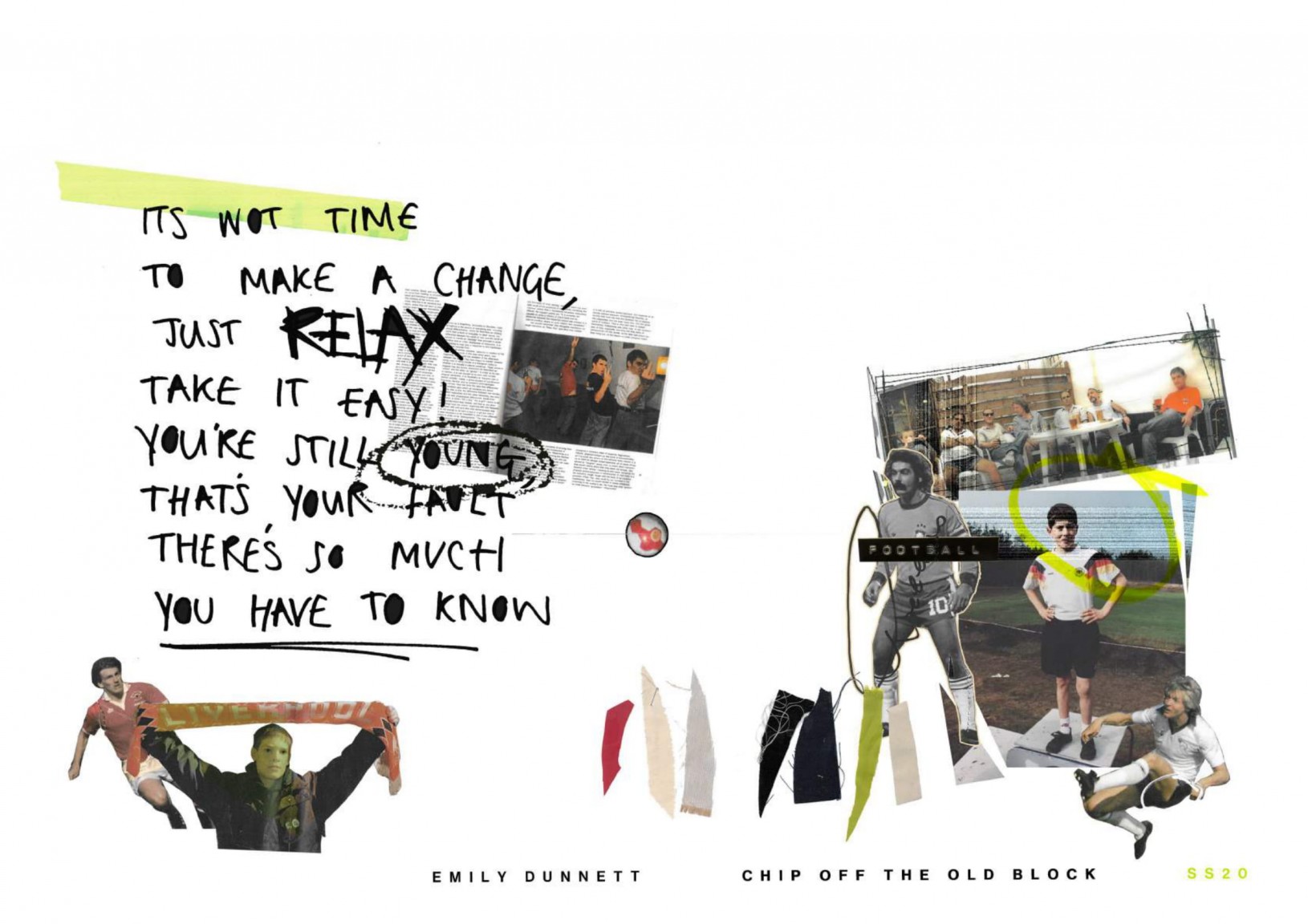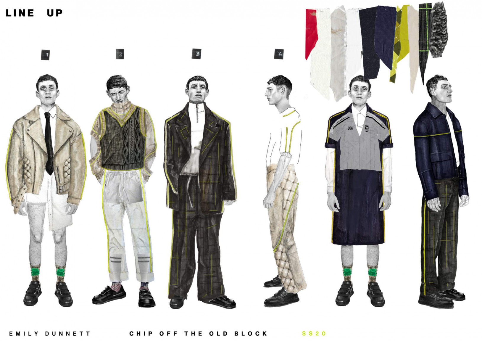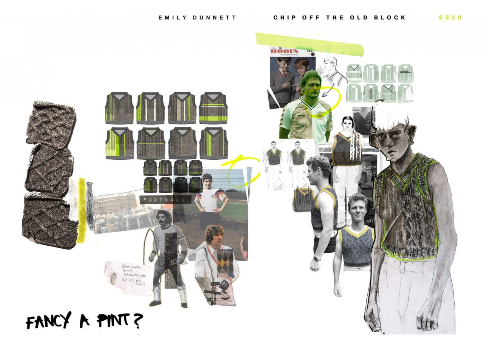 Masculinity, the relationship between father and son and the comfort men find in communities are explored by menswear designer Emily Dunnett’s Graduate Collection, Chip Off the Old Block. This six look capsule collection, features leather work, tailoring, sportswear elements and graphic screen printing techniques as it follows a young boy’s idolisation of his dad, and friendships forged through football, working men’s clubs and motorbikes.