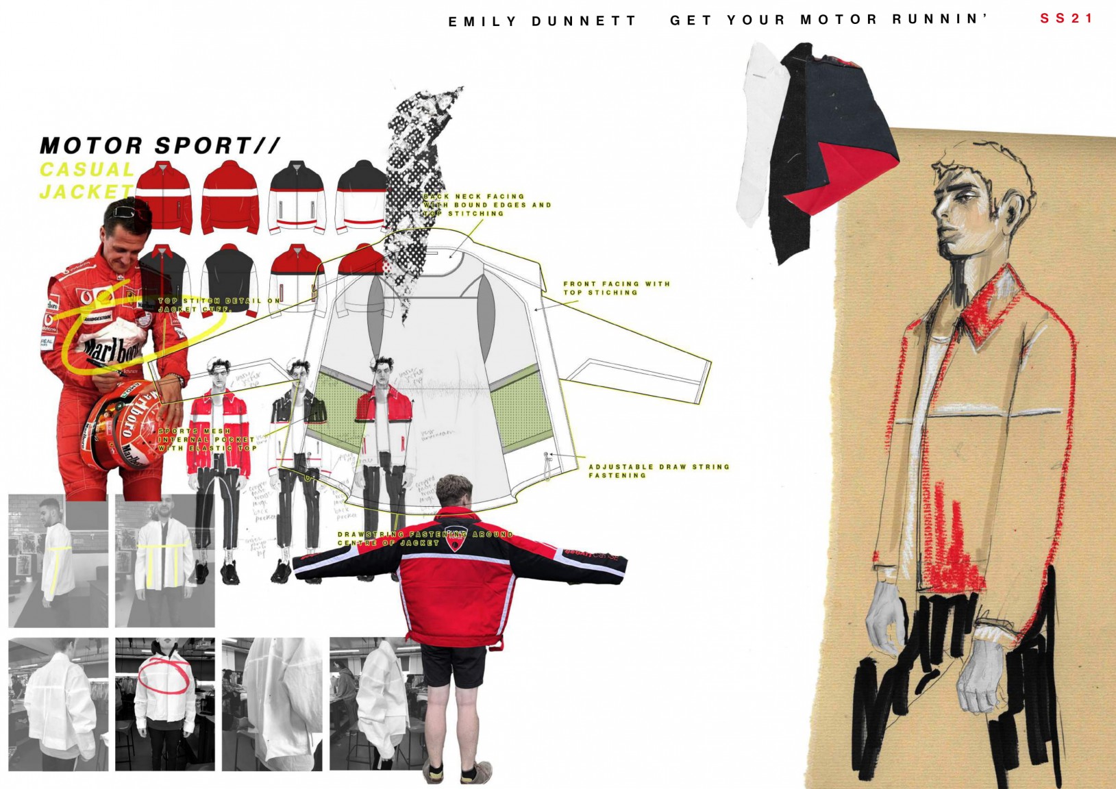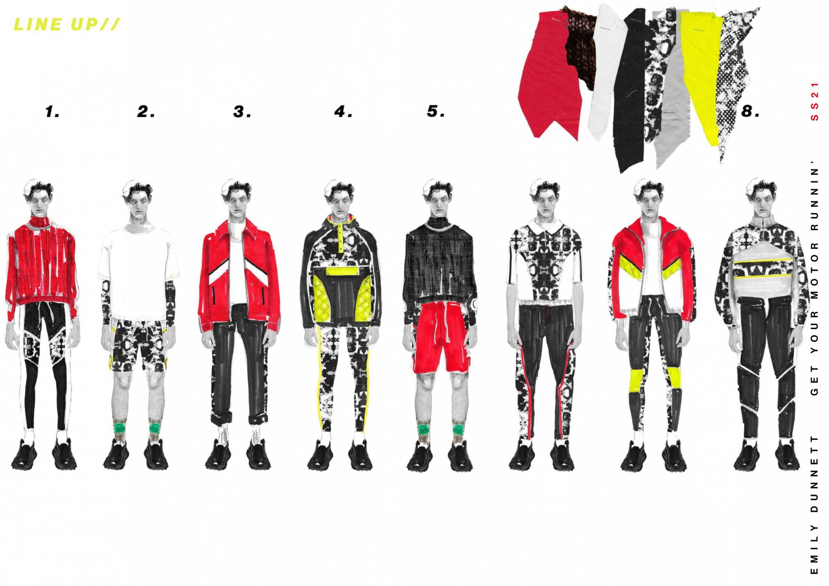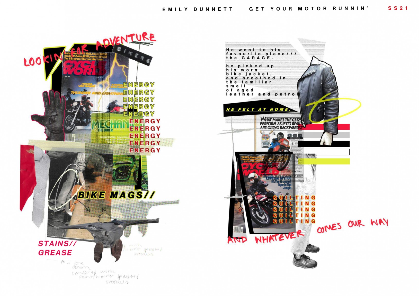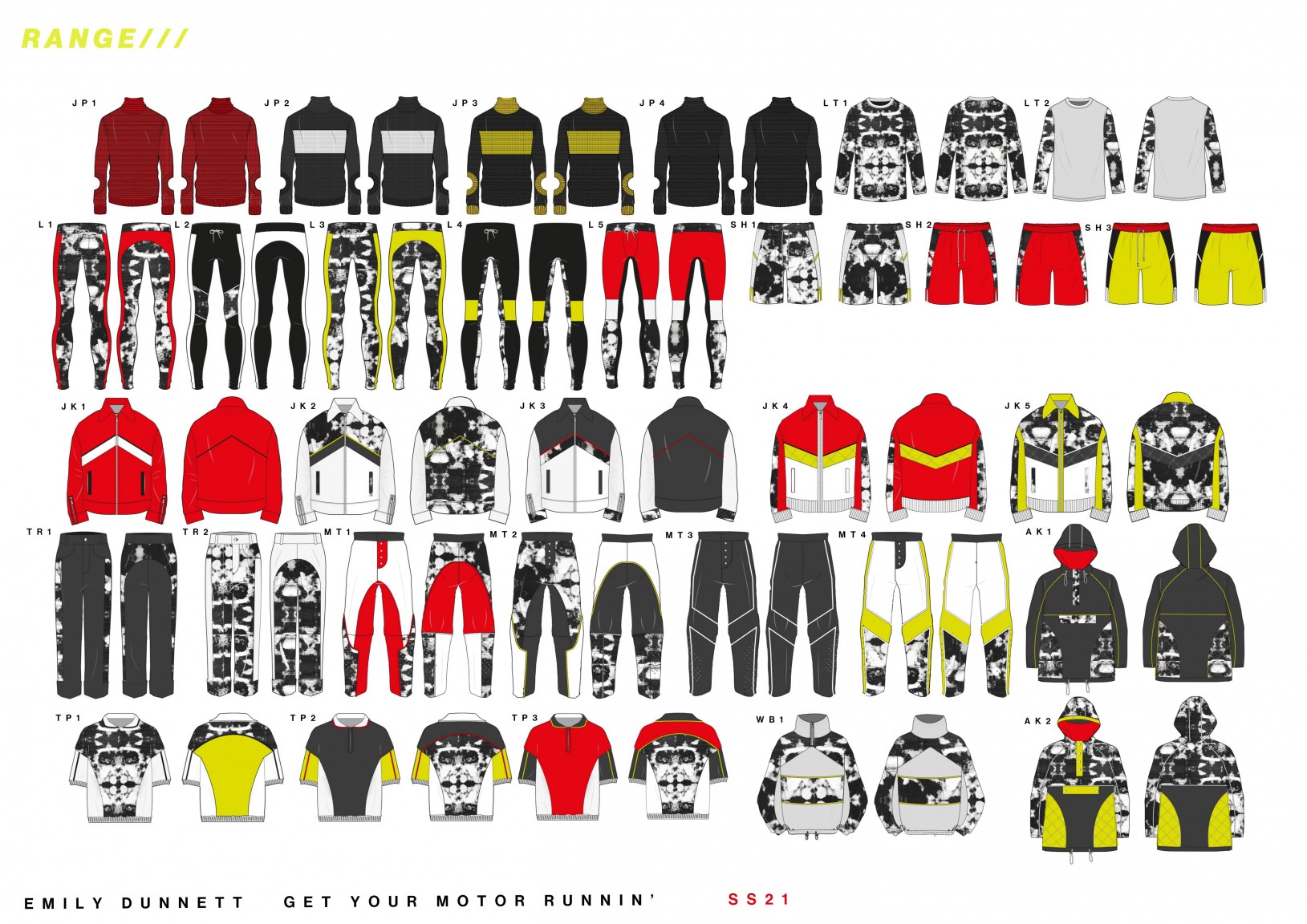 Her development collection, Get Your Motor Runnin’, draws on Dunnett’s memories of her own father “in lockdown, I was surrounded by my dad’s old bike magazines from the 1980’s which had such dynamic front covers. He always in the garage working on his motorbikes whilst I was growing up”. The collection reimagines silhouettes found in biker wear as contemporary sportswear in a mixture of high performance pieces as well more commercial athleisure items.