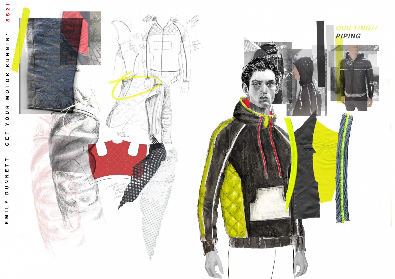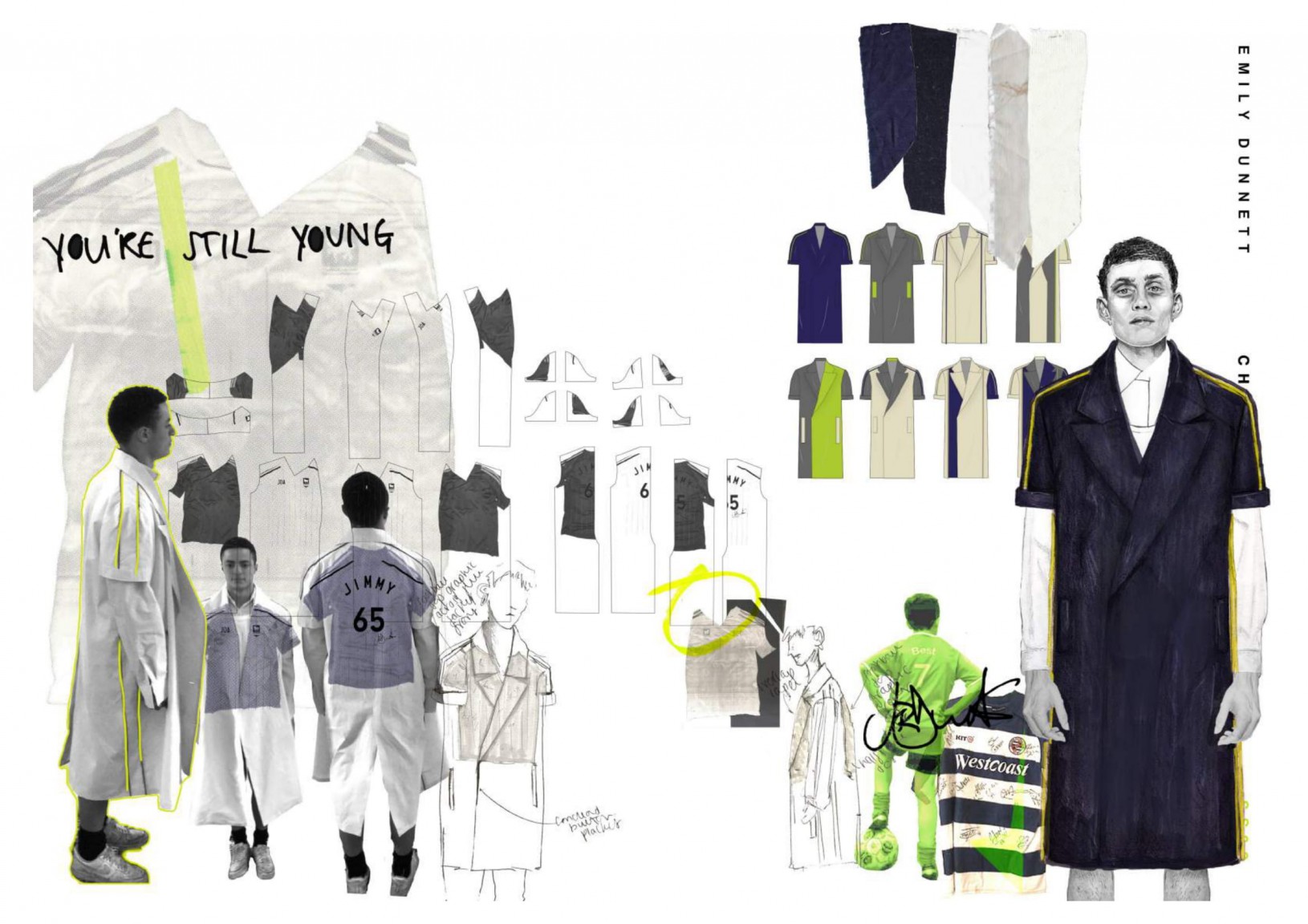 Dunnett’s multimedia approach to design begins by using photography to build a narrative, often including candid street photography of real people doing real things. For her graduate collection, Tom Wood’s photobook “Man” provided an important reference in the mundane and everyday life. She uses this storytelling to produce highly detailed and well considered garments, where traditional tailoring styles might be merged with sportswear elements, graphic print and ergonomic design.