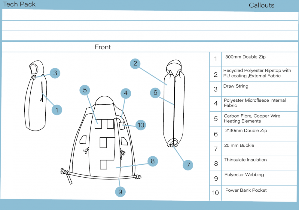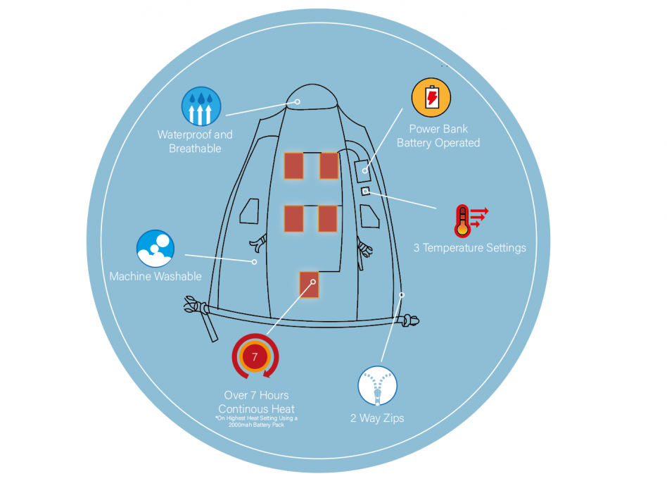 The product is a Heated Thermal Pod. The thermal pod is manufactured from 3 layers of fabric; with carbon fiber heating elements in the inner layer. The external layers recycled polyester ripstop with a PU coating to provide wind and waterproofing. The pod is insulated with thinsulate; an insulation which does not absorb significant moisture. On top of the insulation is the carbon fiber heating elements which with the use of the portable battery pack provide 3 levels of heat to the pod. The Internal layer is micro fleece which helps to provide comfort. The Buckle features on the end and internally allows the pod to be worn and the length altered as well as the option for the product to be used on more critical casualties who will require a stretcher.