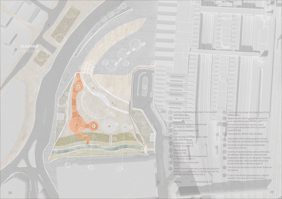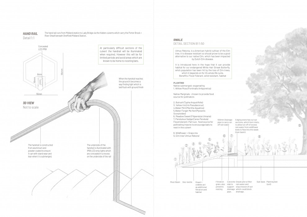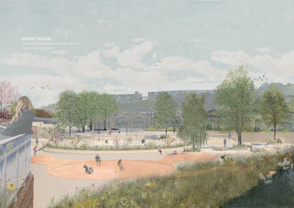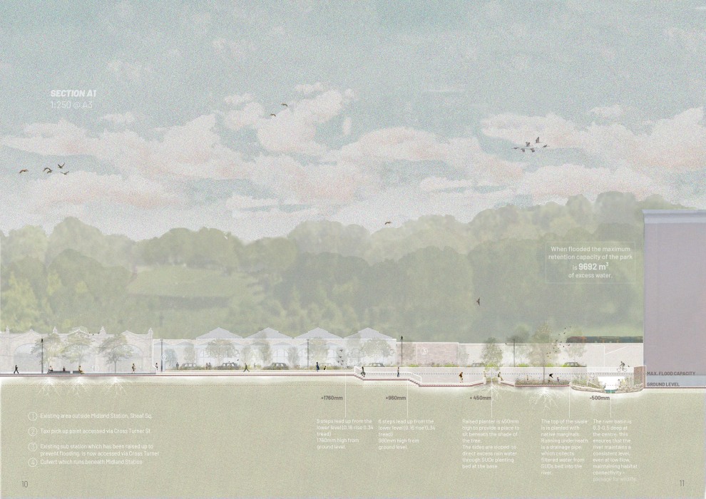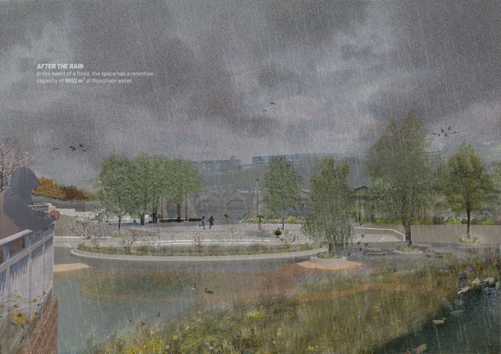 Common Ground is a sunken park which can be used by people to immerse themselves in nature, play and socialise. It is a place to observe and study the condition of our rivers and native species, and through education, reconnect young people to their environment. However, when it rains and humans retreat, the space can be completely consumed, holding 9692m³ of excess rain/flood water. Designed to slow the flow of the river and increase retention in the city centre, providing an early warning to communities down river, and potentially reducing the impact on them.