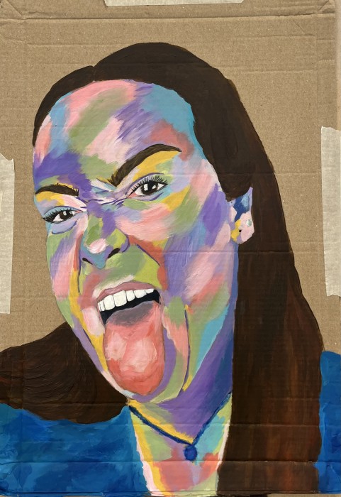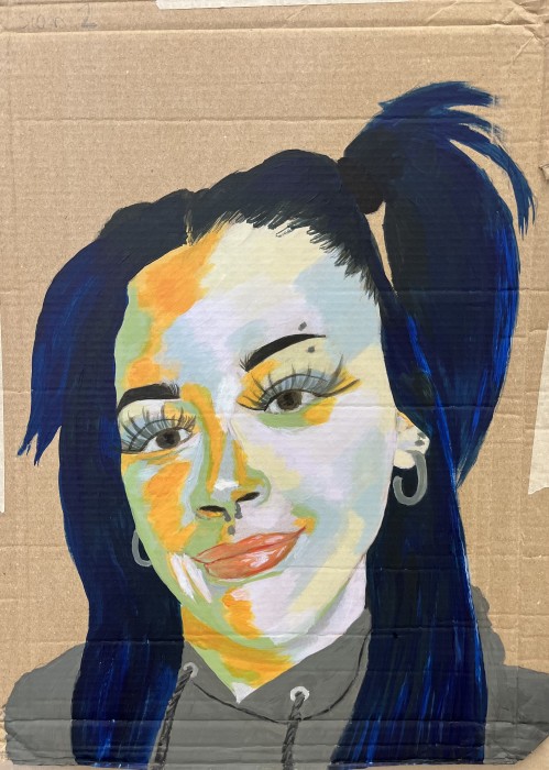 Working a lot with colour, Aliya often explores the power and effect of colour as a form of expression throughout her pieces. Aliya’s recent works have focused on working with acrylic paint on found materials, with recycled pieces of Amazon packages being one of her main mediums of choice. She has also worked on pieces of greyboard she has found and the occasional canvas.