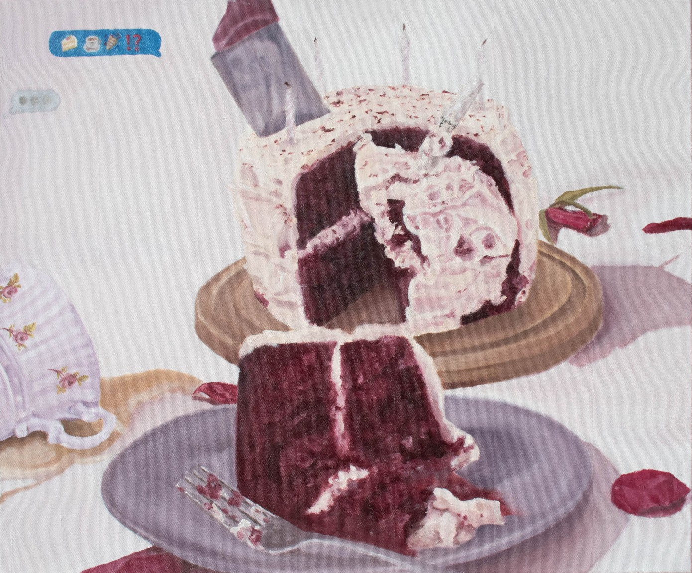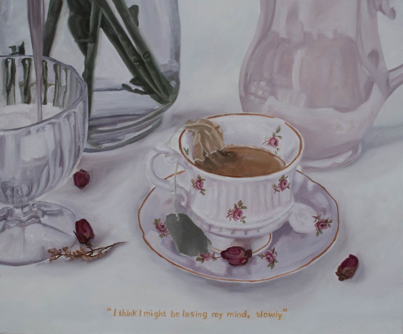 Consisting of still life and figurative paintings, supported by photography, her work aims to create narratives containing metaphors and satirical statements, acting as a looking glass into her observations and relationship with these ideas.