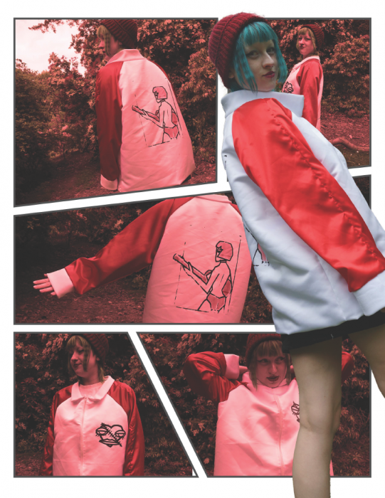 Rose Mayer combines illustrations with classic street wear, designs are made that don’t remake the wheel, but imprint on it, customizing it, making it her own, using a combination of printing and embroidery, Mayer’s work really focuses on her graphic design rather than the shape of the garment.