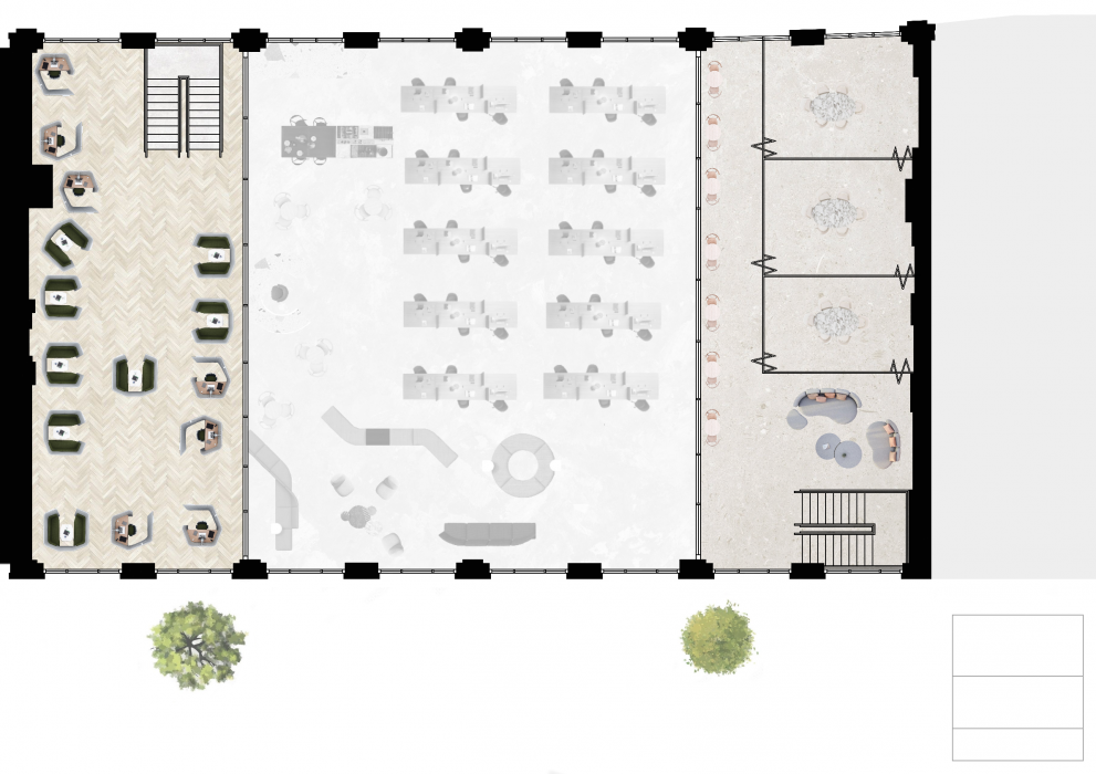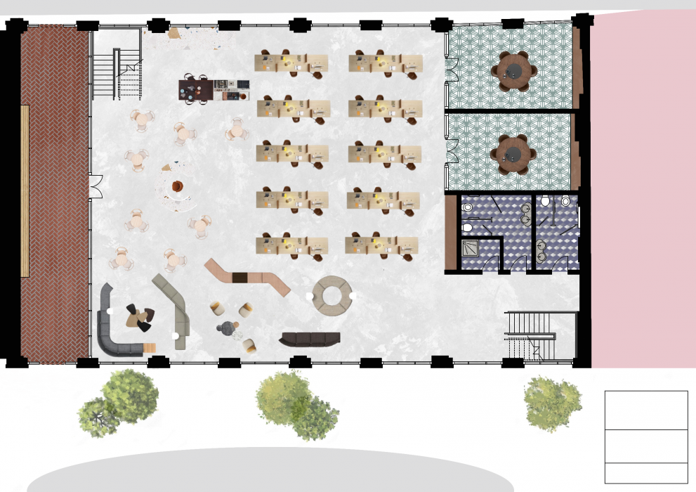 Her objective was to design an office space tailored to the needs of young professionals who have recently graduated from university and are embarking on their self-employed ventures within the design sector. The aim was to fashion a space that strikes a balance between practicality and functionality while fostering an atmosphere of creativity and collaboration.